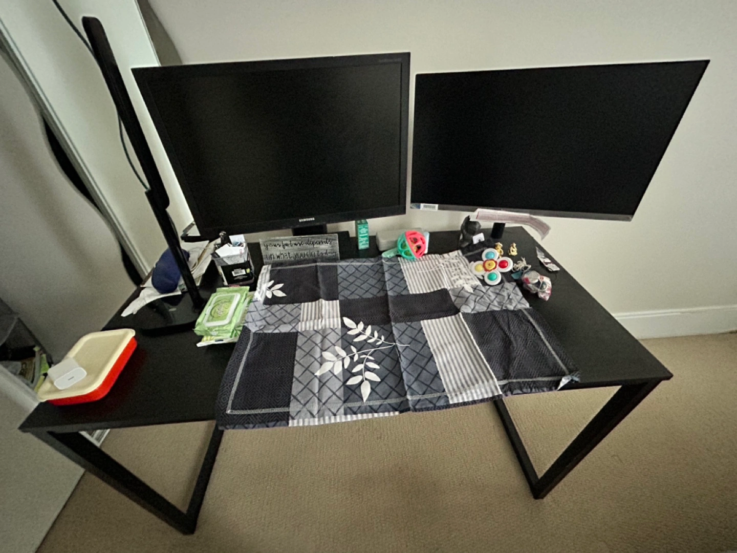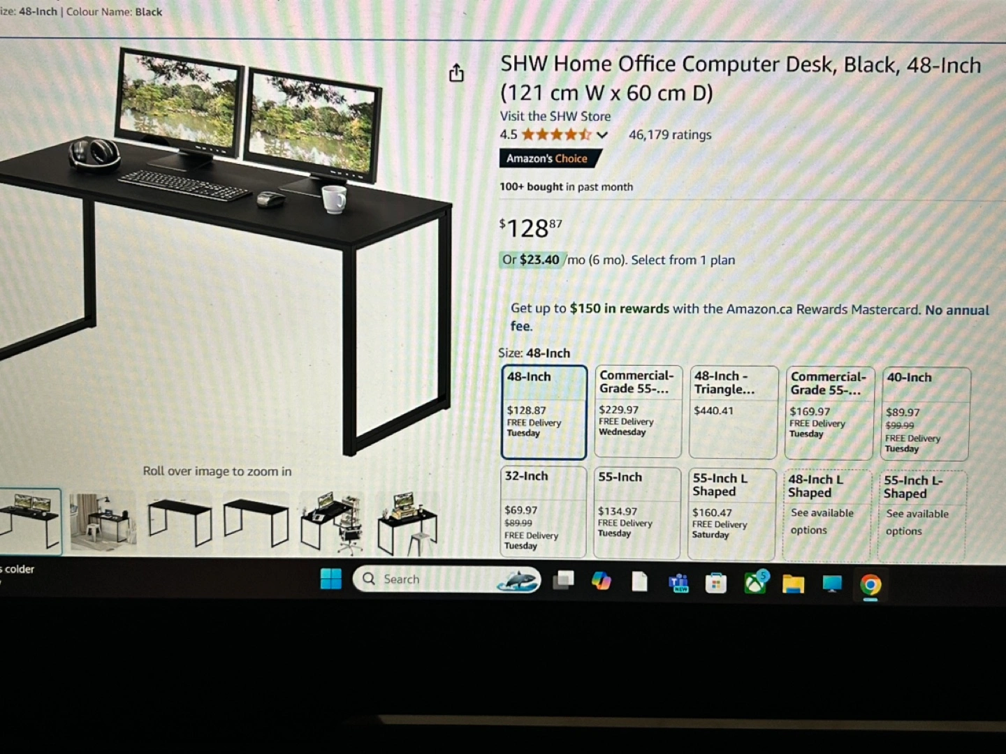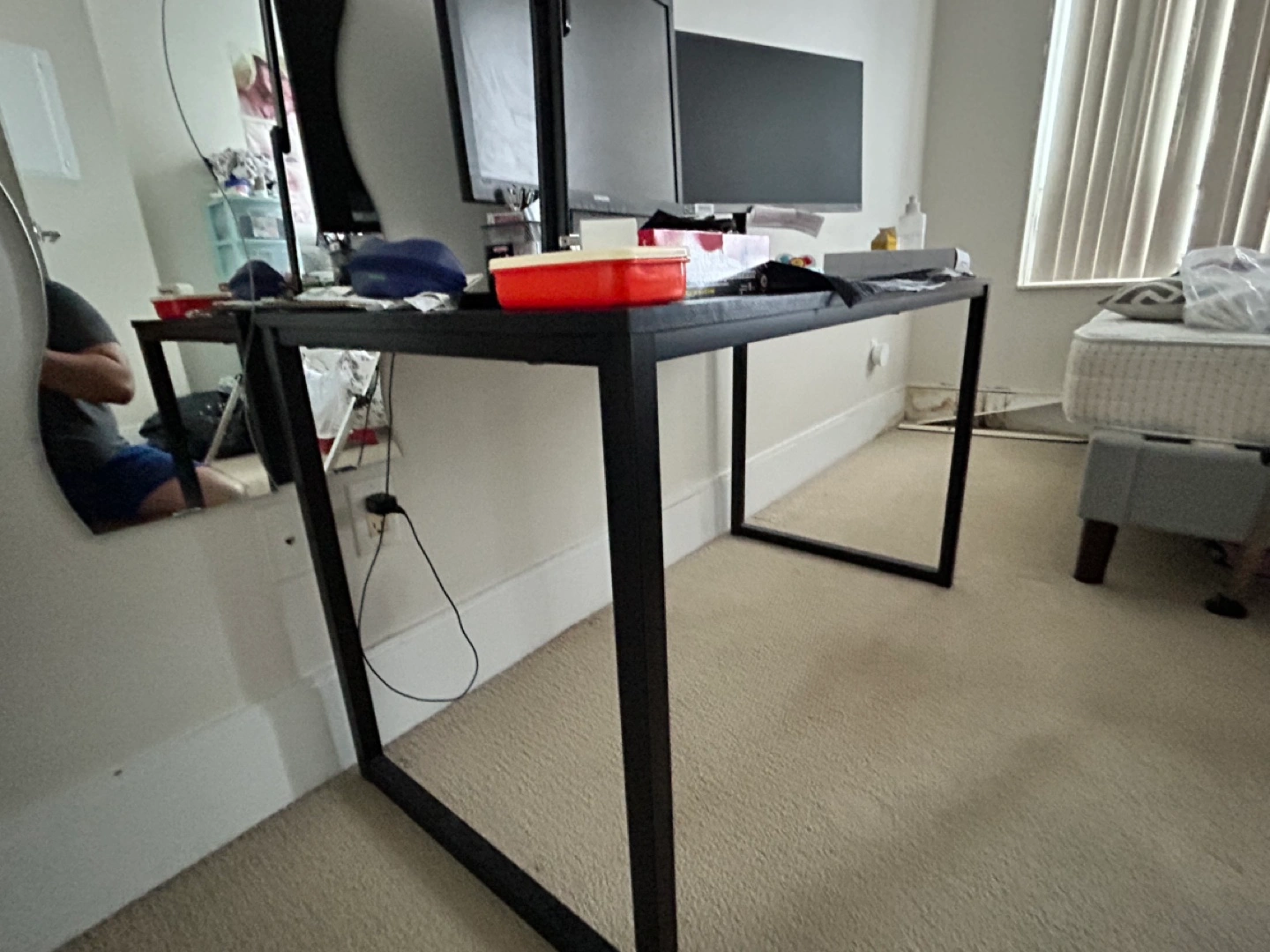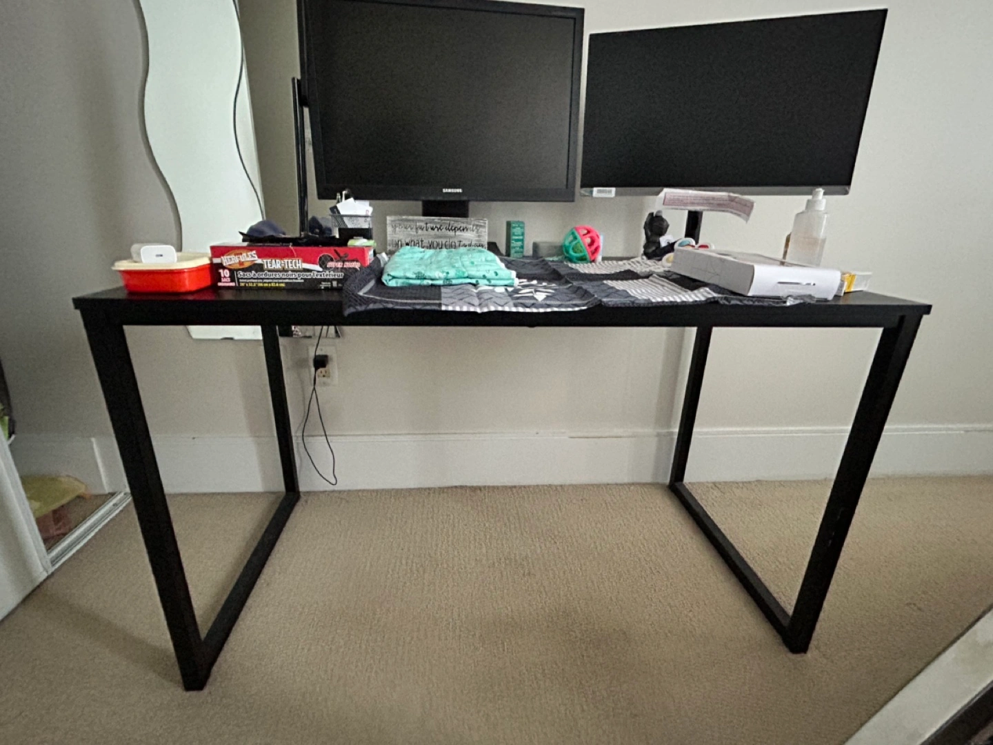 Black computer desk. Minimalist design. Sturdy metal frame. Great for home office or gaming setup. 48 inches wide. Easy Assembly.