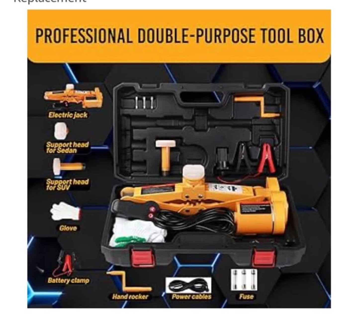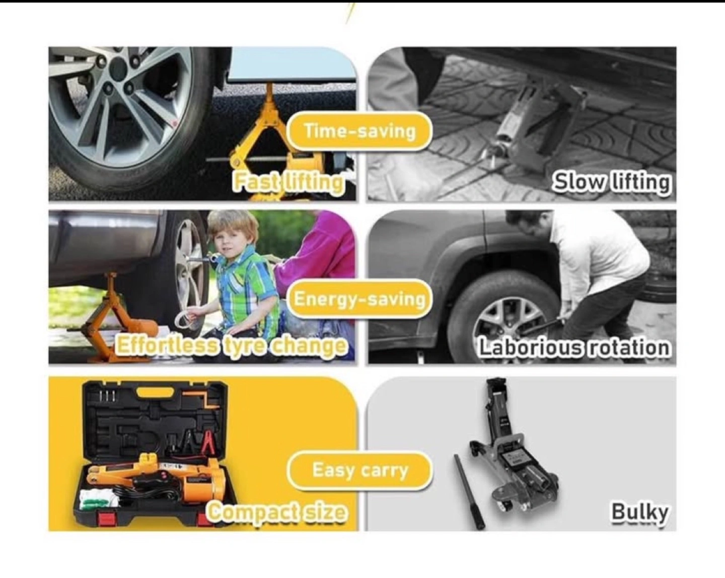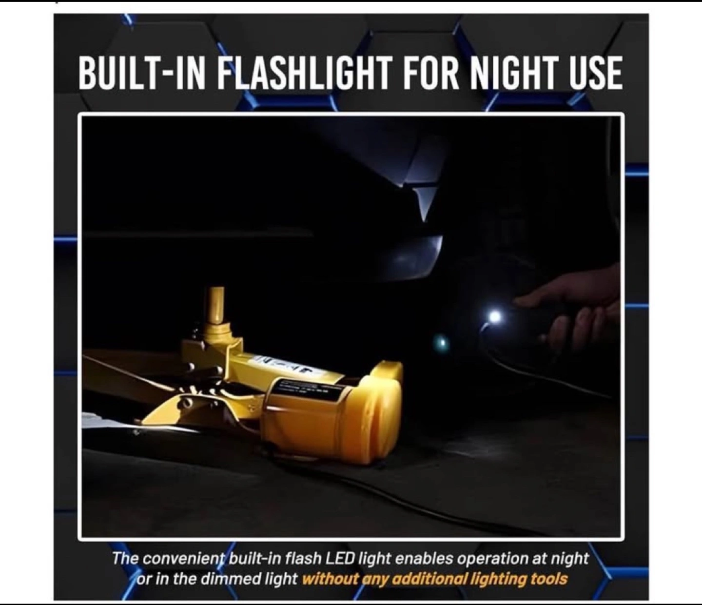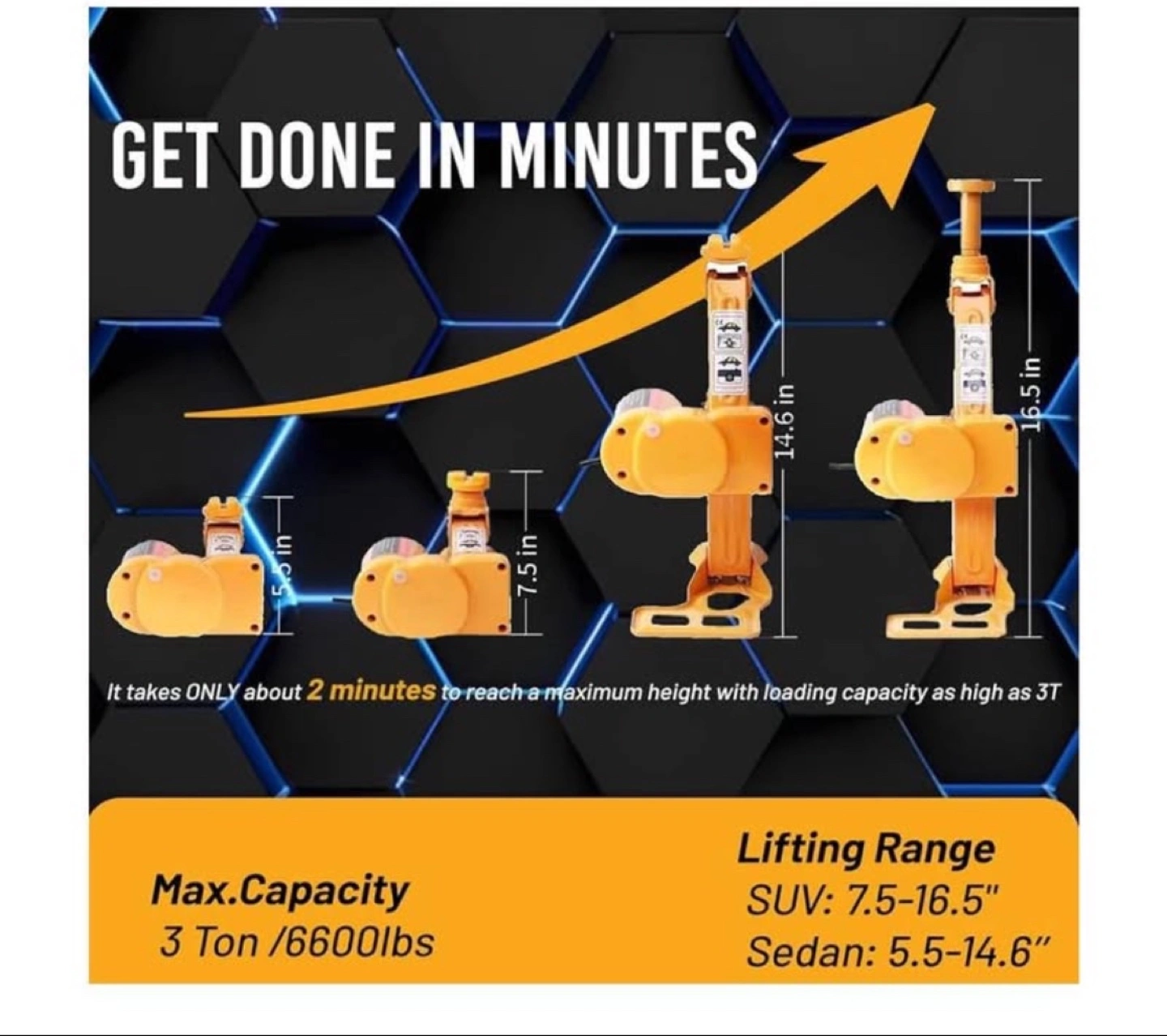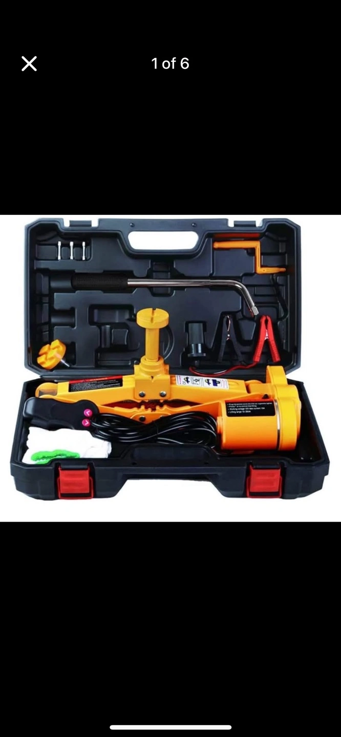 This electric scissor jack must be used on a flat ground and placed parallel to your car. Thanks to its overrall sturdy construction large base and saddle this electric car jack is super strong and stable. To ensure maximum safety this jack will automatically stop working when it reaches the height limitation (16.5in). Best choice for Sedan and SUV(under 3T): Comes with two different raised heads for Sedan and SUV this electric car jack can easily lift vehicles under 3 tons but DO NOT use it on the trucks and those beyond 3 tons. To power the jack you can either connect it to cigarette lighter or car s battery. When running into roadside Get Done in Minutes: It takes ONLY about 2 minutes to reach a maximum height (17in) with loading capacity as high as 3T. Whether men or women can replace the tire with ease in any emergent case.Save Effort :electric car jack with Controller is perfect for emergent roadside tire change and repair. Built-in flashlight for Night Use: The convenient built-in flash LED light enables operation at night or in the dimmed light without any additional lighting tools.Besides it s totally water-proof so you can use it even on rainy day.Especially including a newly developed jump starter the car repair tool let you no more fighting with an old-fashioned hand jack or the dark of a night.Just power on the jump starter and touch a button for smooth lift Professional Double-Purpose Tool Box: The Package includes electric car jack x1(SUV headx1 Sedan headx1) a suitcase and 2 spare fuses.The structure of the electric car floor jack is succinct and easy to operate with a compact and organized storage box. All the electric jacks are equipped with a powerful firm suitcase which helps keeping the components and parts well organized and conveniently fits in your vehicle.By the time it can also act as a road sign when you stand it behind the car.