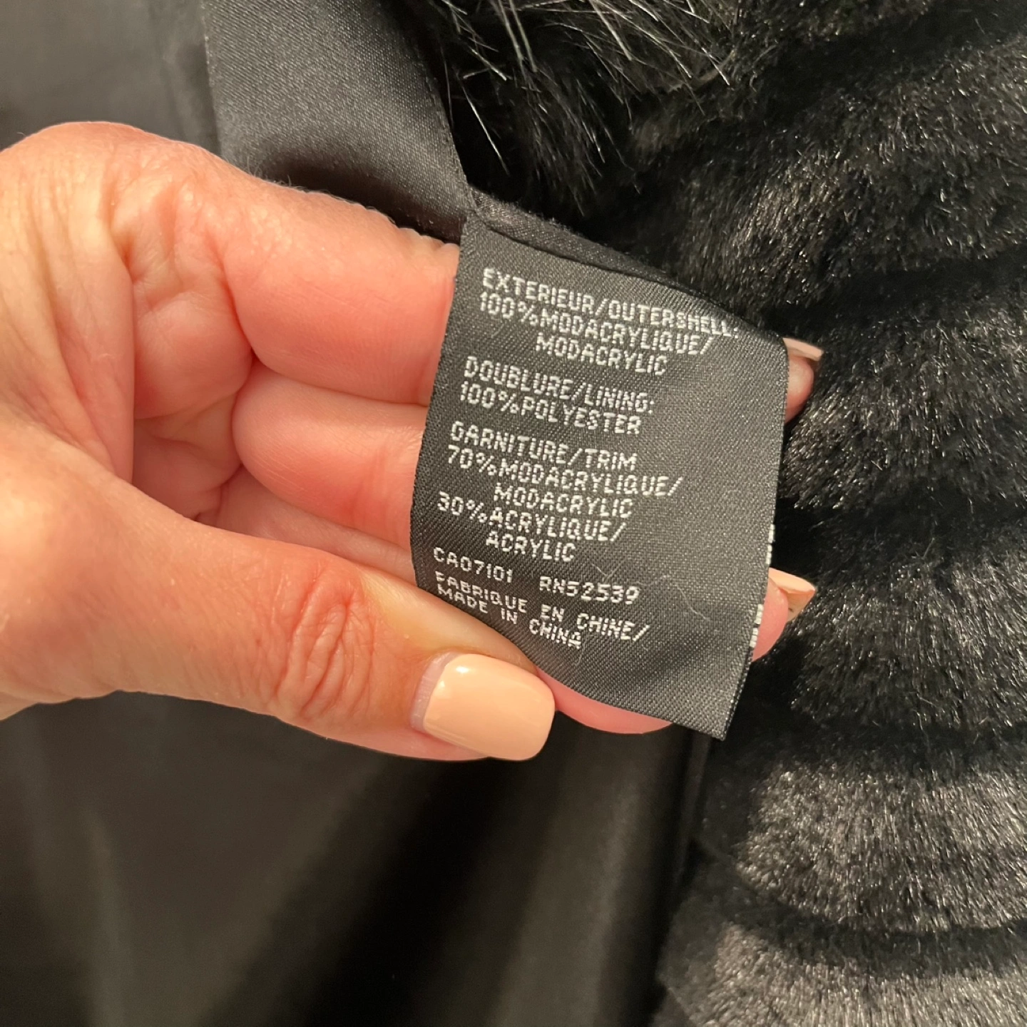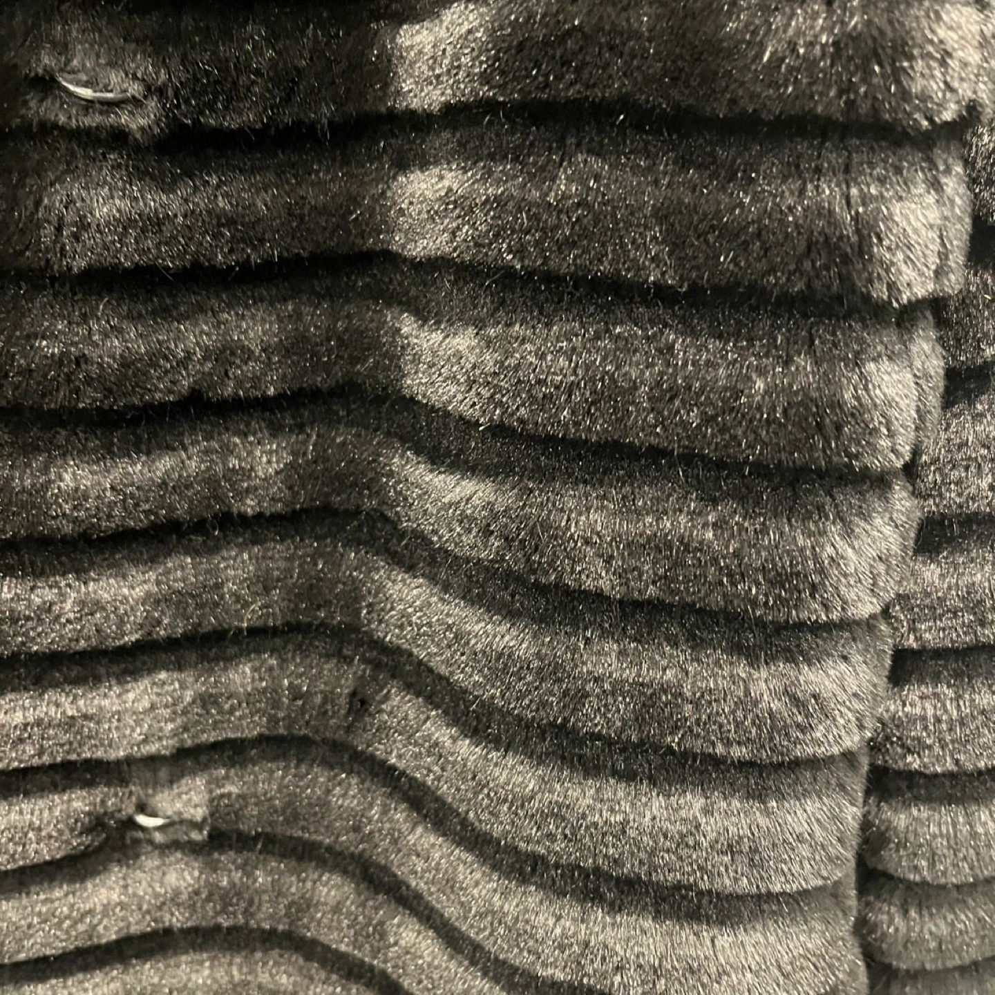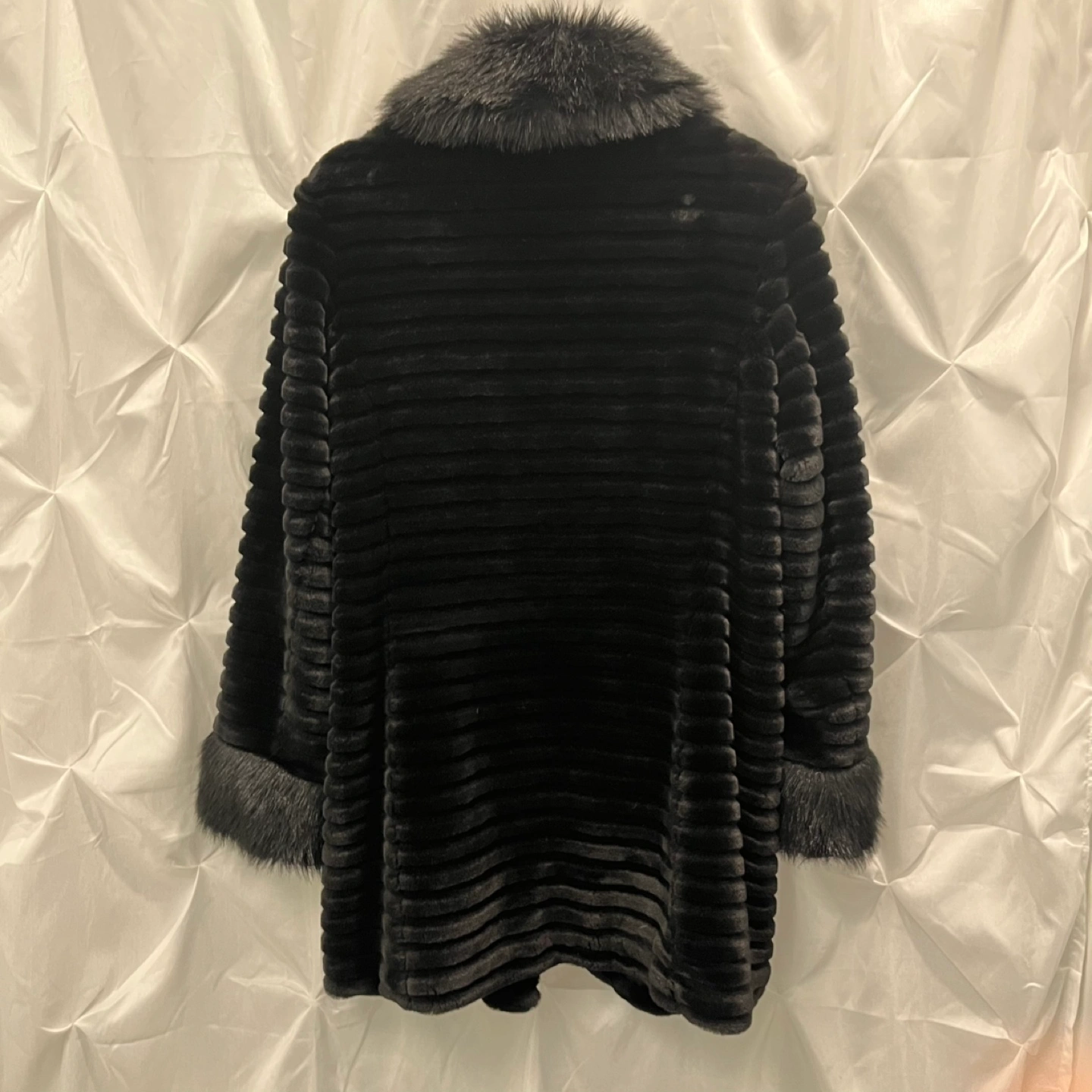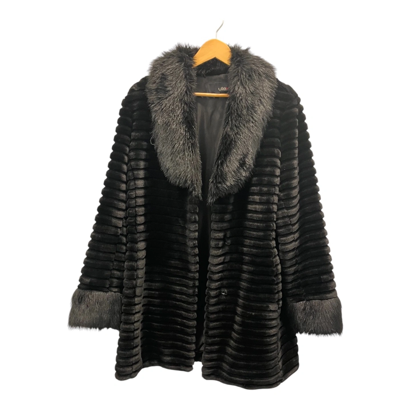 Stylish black faux fur jacket. Features a large collar and cuffs. Ribbed texture. Great for colder weather. Simple button closure. Pockets. Very warm and fashionable