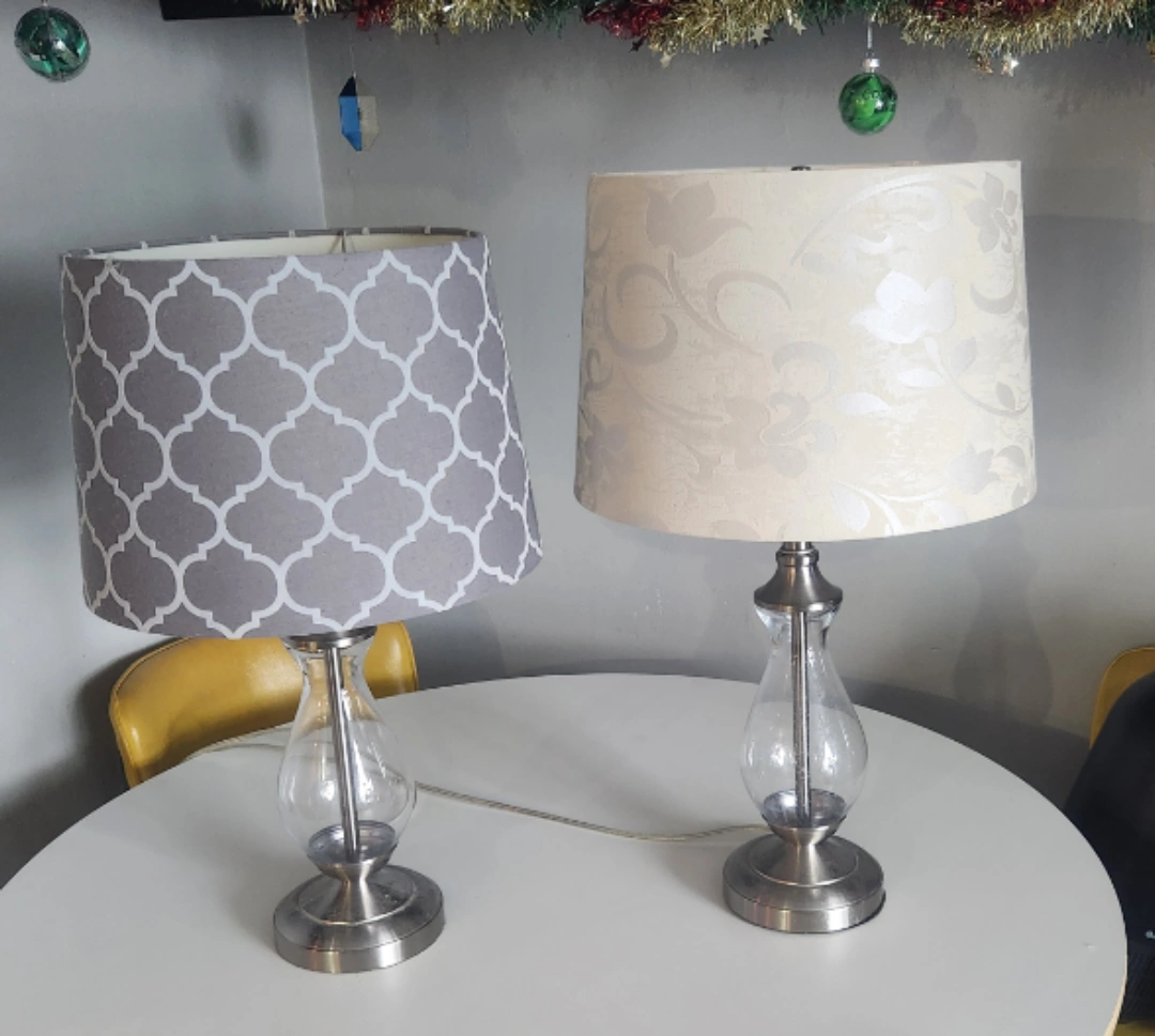Two matching table lamps. Brushed nickel bases. Clear glass accents. One lamp has a grey geometric patterned shade. The other has an off-white floral shade. Both shades are in good condition.