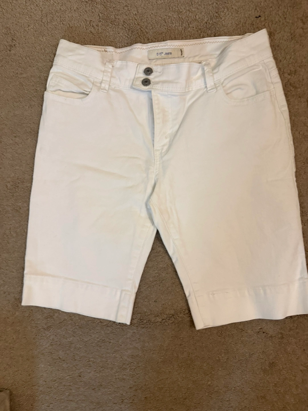 Women's Levi's 515 white denim shorts. Size 10P. Cuffed hems. Five-pocket styling. Button and zipper closure.
