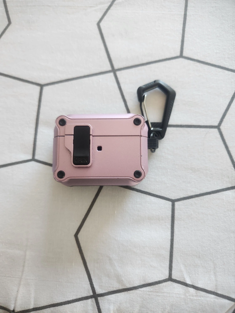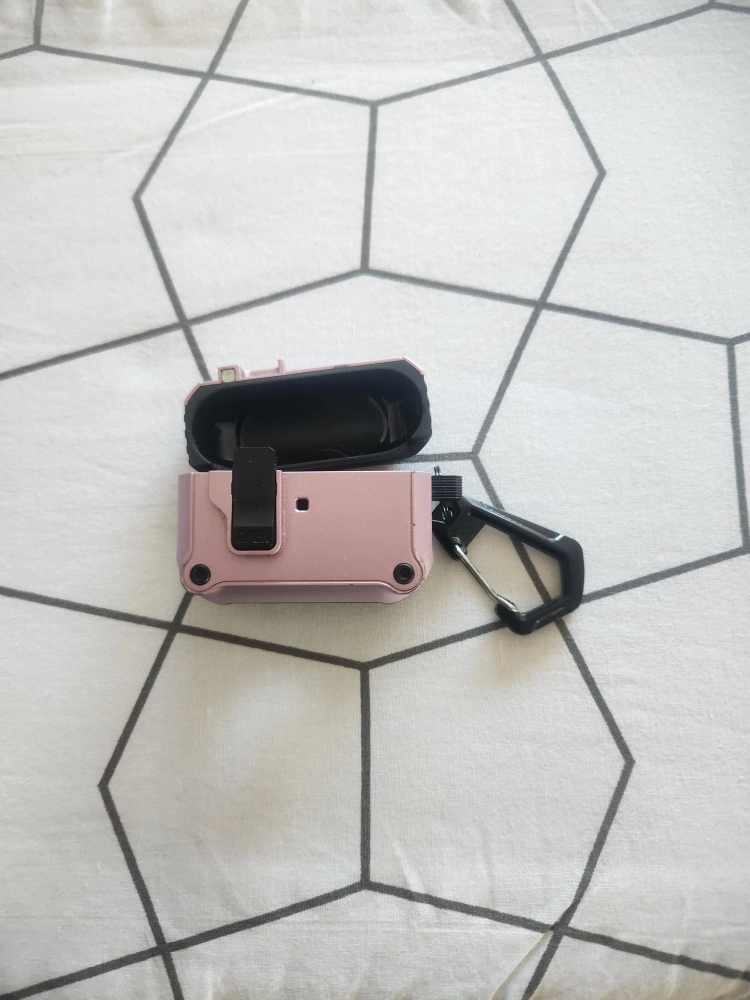 Protective case for AirPods Pro. Durable, purple colour. Includes carabiner for easy portability.