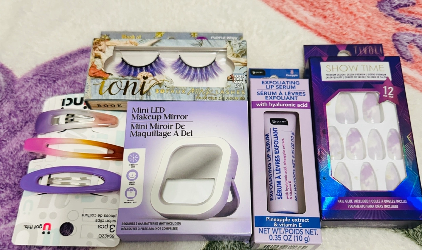Grab this amazing bundle perfect for your next glam look! Includes false eyelashes, a mini LED makeup mirror, exfoliating lip serum, press-on nails and colourful hair clips. All items are new.
