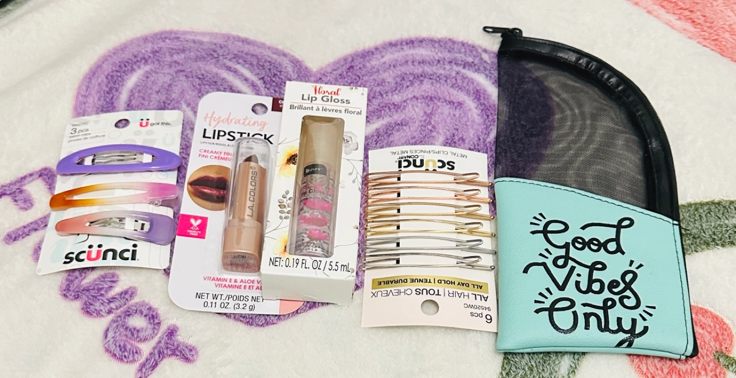 Grab this cute bundle! Includes LA Colors lipstick and lip gloss, Scunci hair clips and bobby pins, and a mesh pouch. Perfect for travel or everyday use.