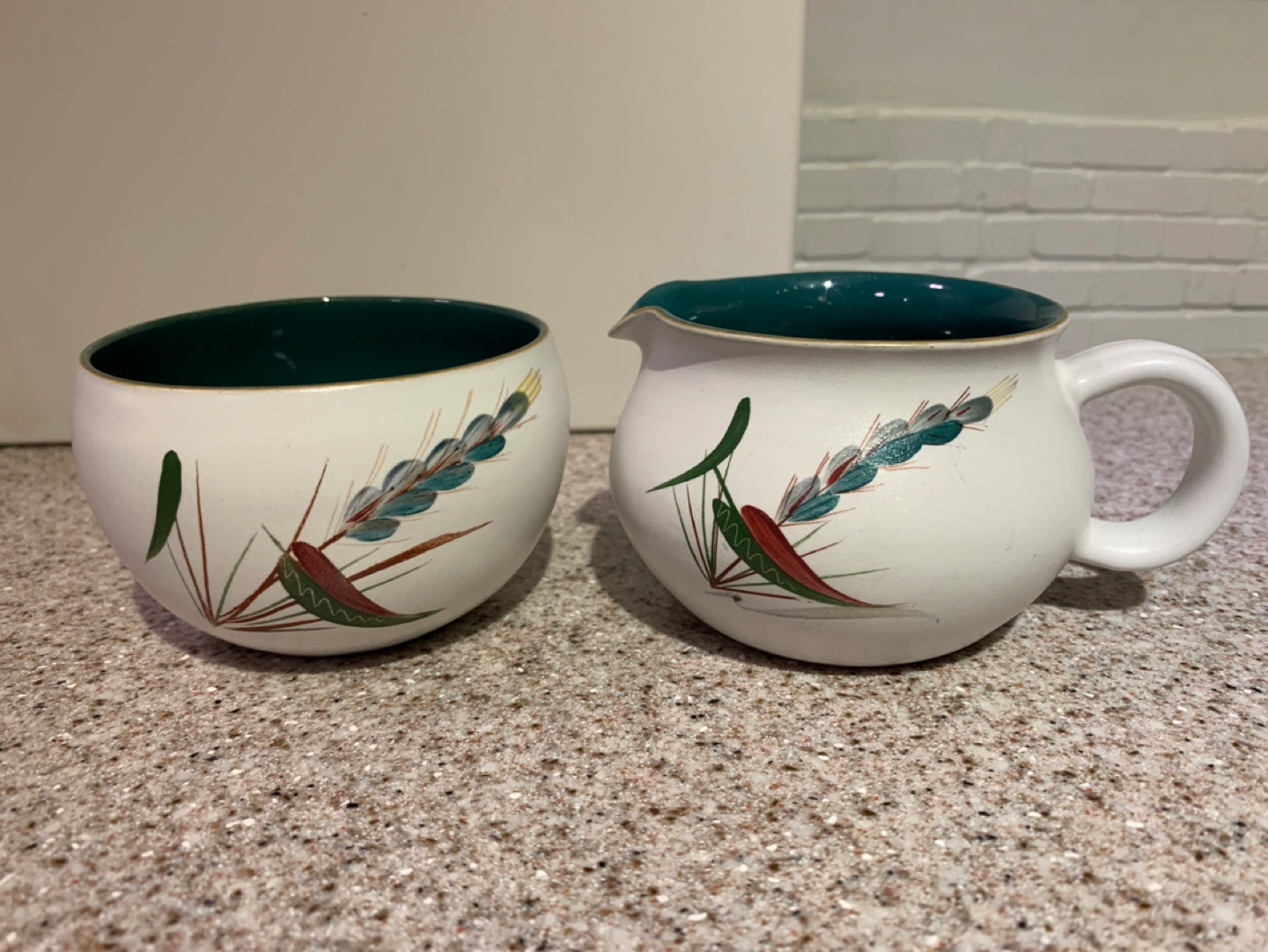 Vintage Midwinter Wheat sugar bowl and creamer set. Denby Made in England. Cream coloured with green accents. Beautiful wheat design.