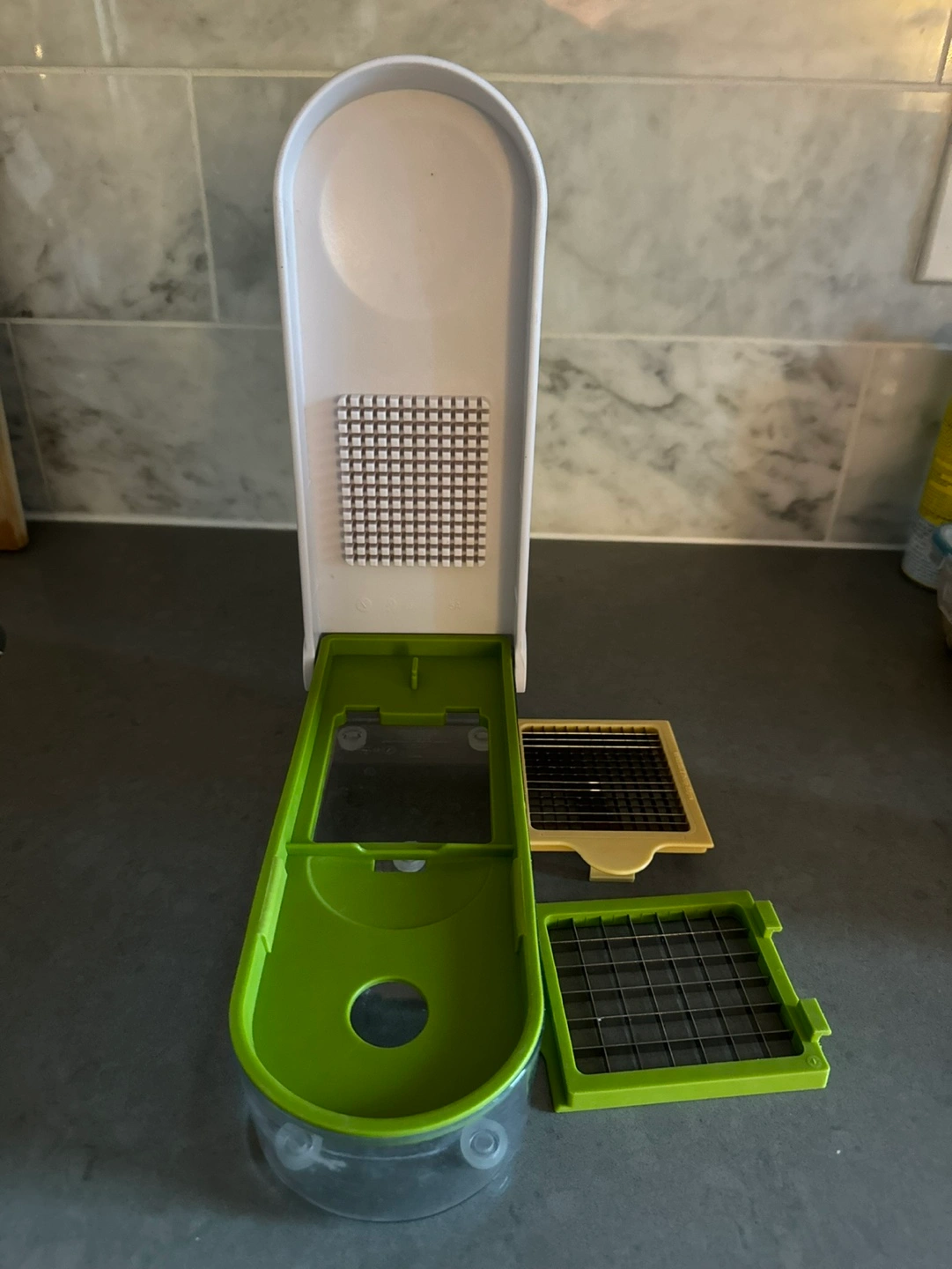 Compact and easy-to-use vegetable chopper. Includes multiple interchangeable blades for various chopping styles. Great for prepping vegetables quickly.