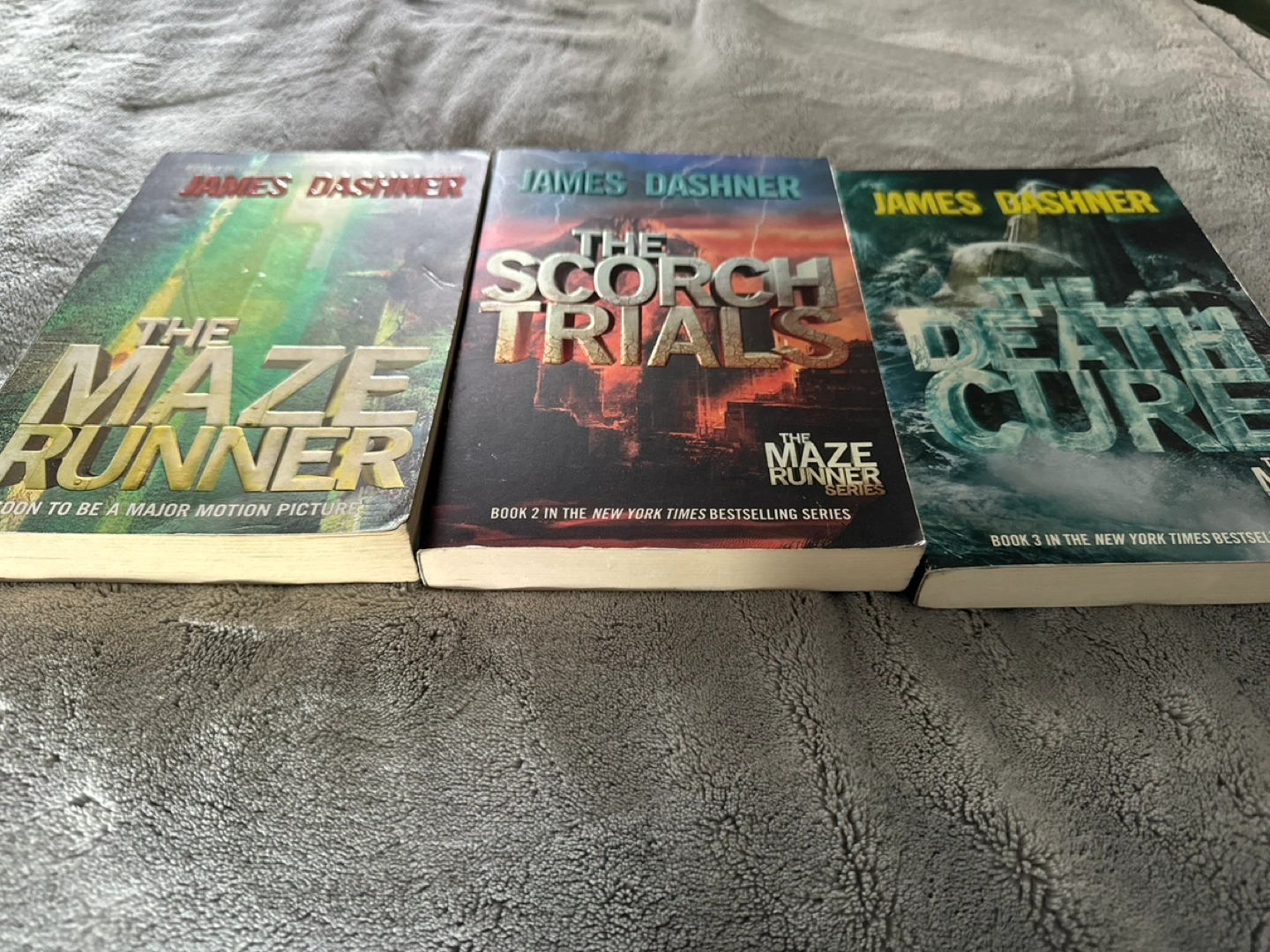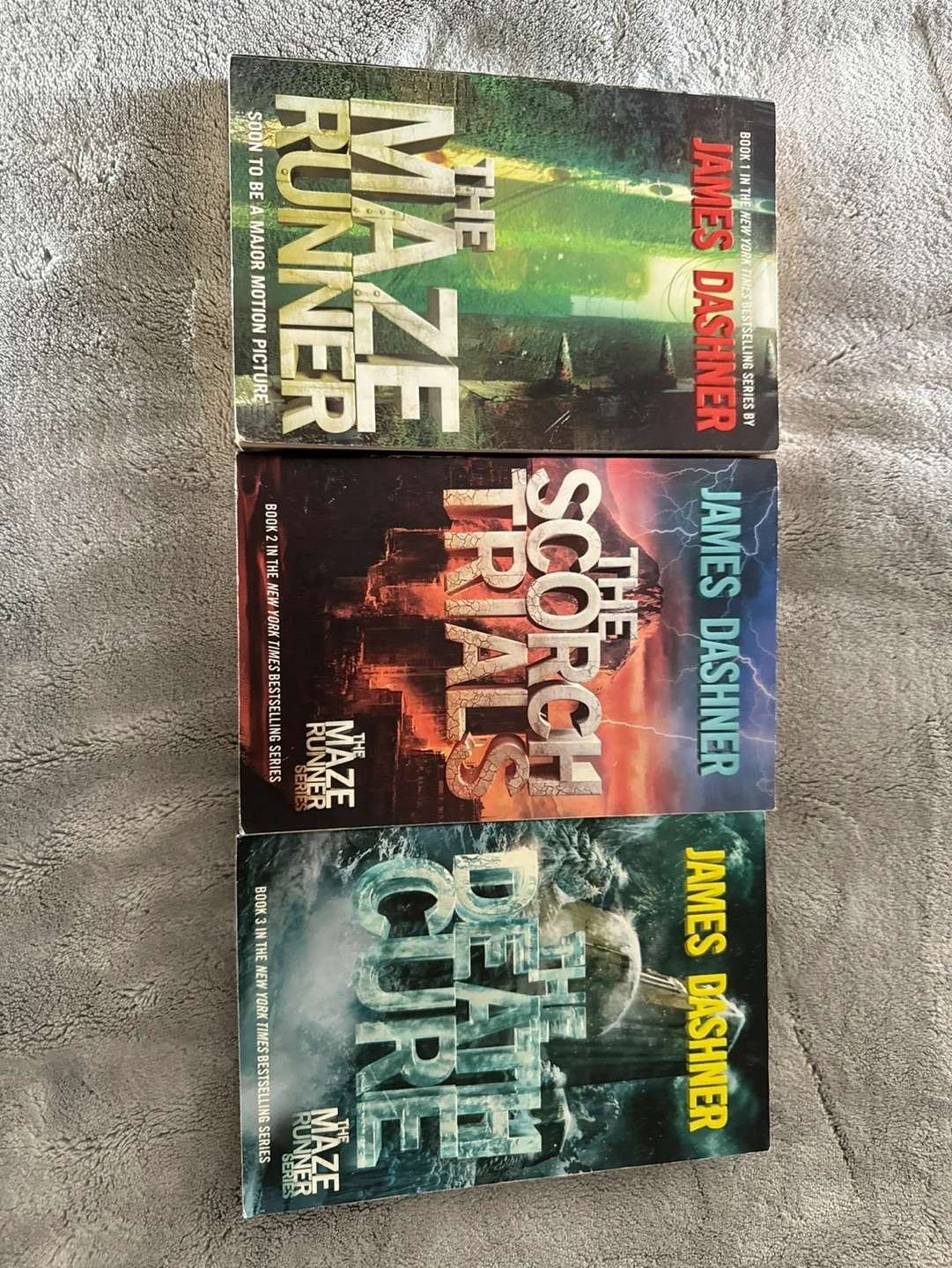 Complete Maze Runner trilogy by James Dashner. Includes The Maze Runner, The Scorch Trials, and The Death Cure. Paperback books. Good condition.