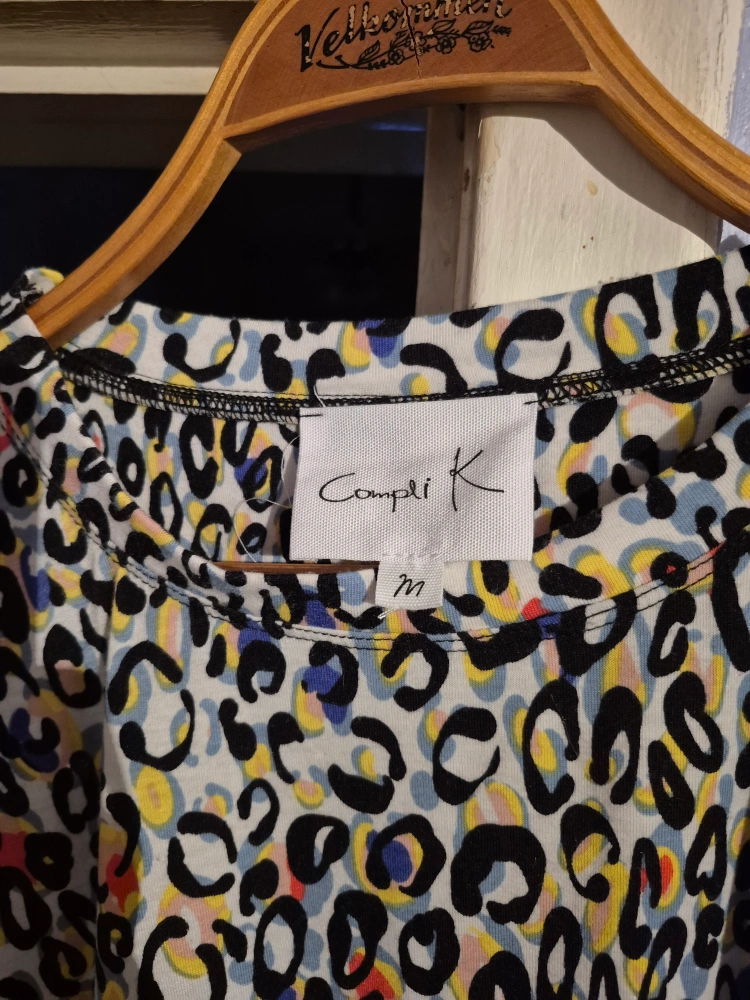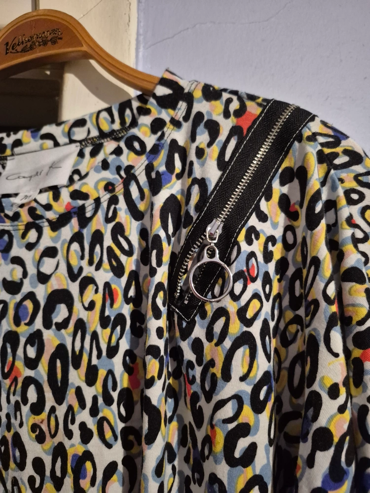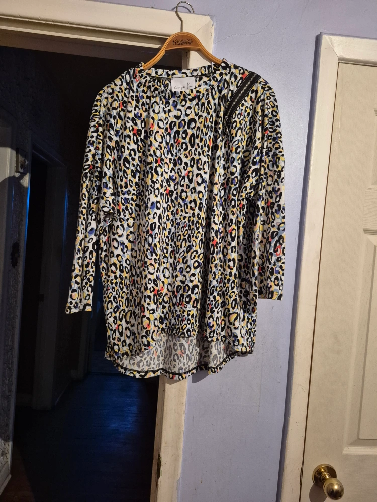 Women's size medium top. Three-quarter sleeves. Abstract leopard print. Features a zipper detail on the shoulder. Casual style.