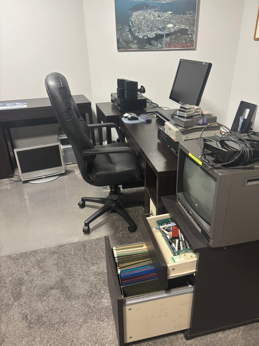 Dark brown computer desk with pull-out keyboard tray. Includes matching filing cabinet with two drawers. Some office supplies included. Samsung monitor visible on desk. Sony stereo system and JVC television also pictured. Bosch promotional material on desk surface.
