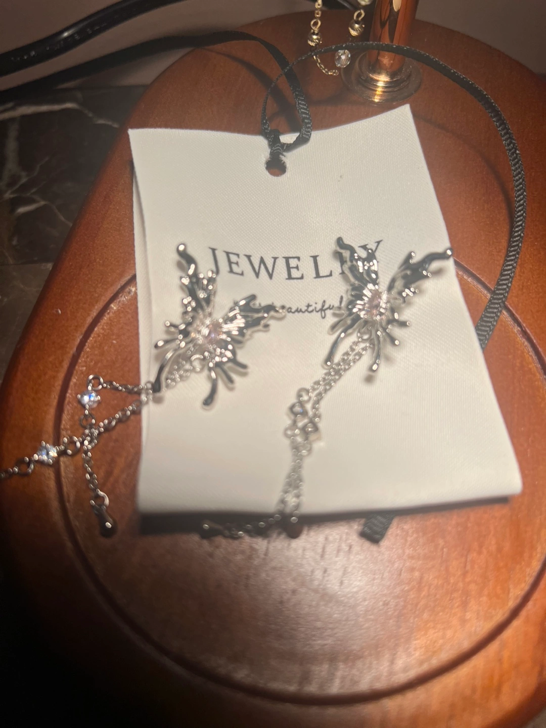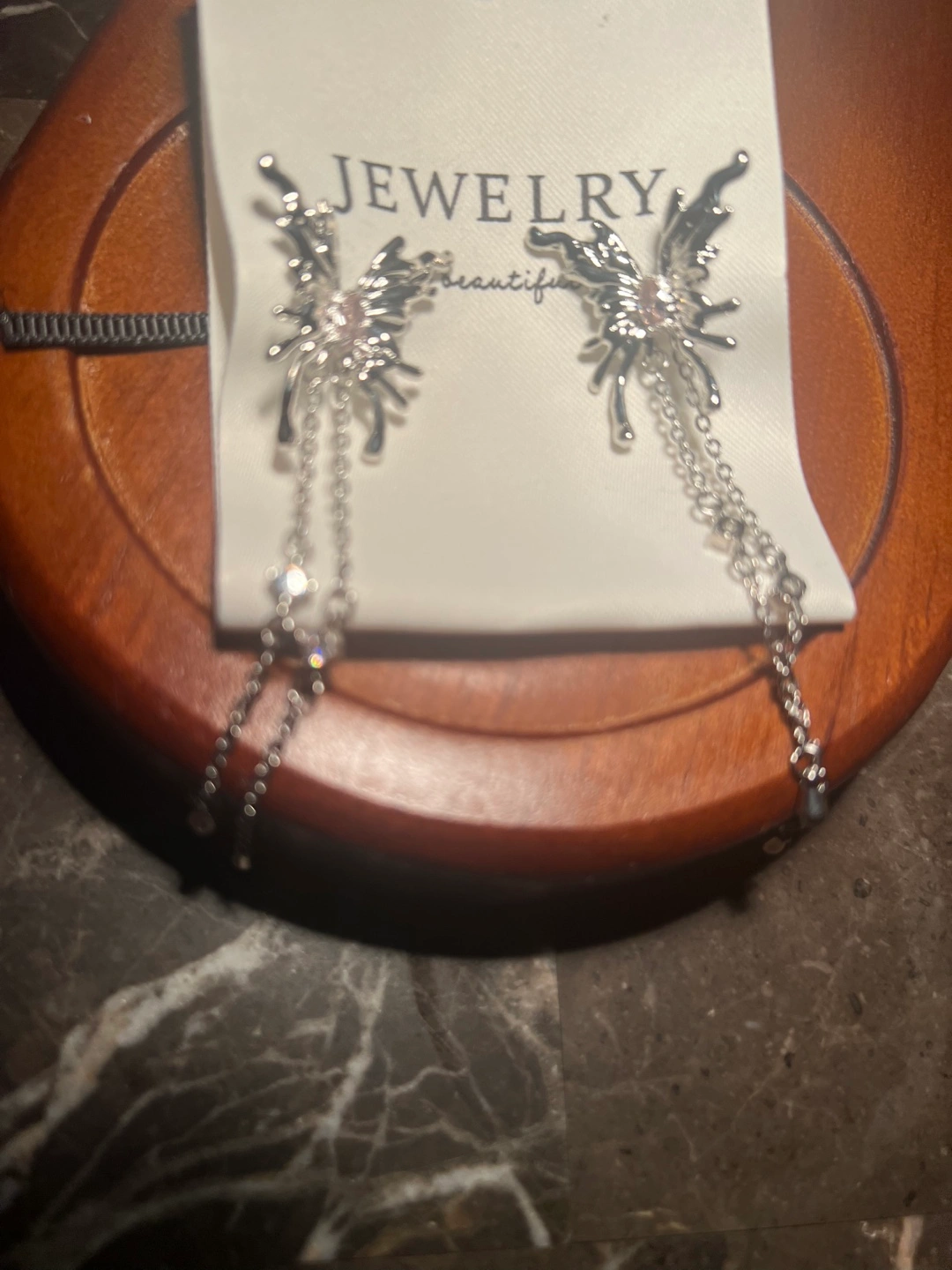 Beautiful silver butterfly earrings. Features dangling chains and clear rhinestones. Elegant design, perfect for adding a touch of sparkle to any outfit.