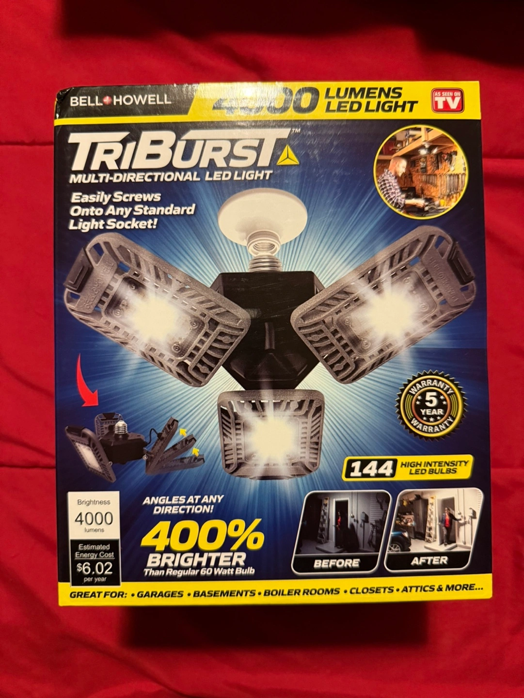 250Multi-directional LED light. Easily screws onto any standard light socket. 400% brighter than regular 60-watt bulbs. Great for garages, basements, boiler rooms, closets, attics, and more. Includes a 5-year warranty. I have 3 lights brand new in the box