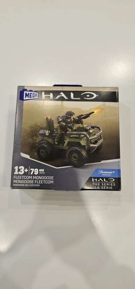New in box. Mega Construx Halo building set. Features a Mongoose vehicle and a minifigure. Ages 13+. 79 pieces.