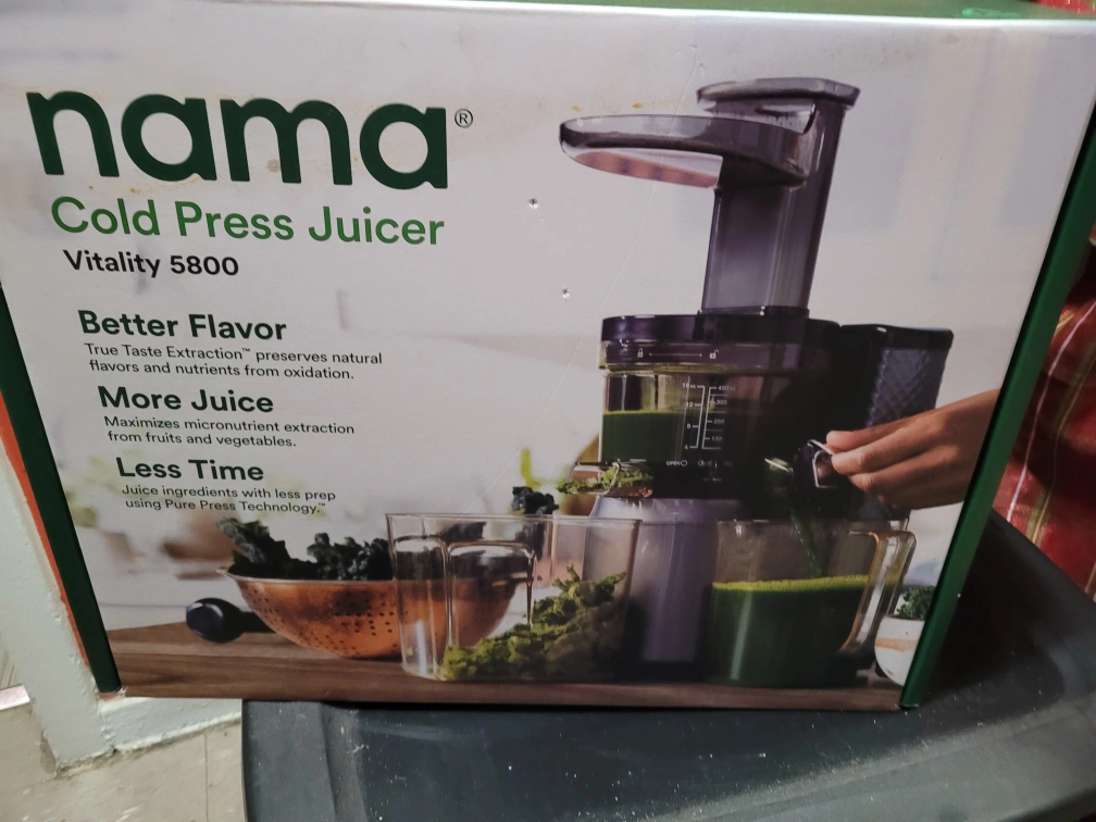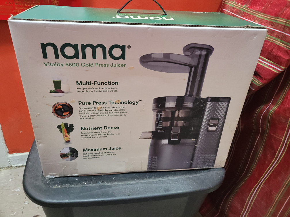 Brand new, never used Nama Vitality 5800 cold press juicer. Still in original packaging. Features True Taste Extraction for optimal flavour and nutrition. Maximizes micronutrient extraction from fruits and vegetables. Includes multiple strainers to create juices, smoothies, nut milks and sorbets.