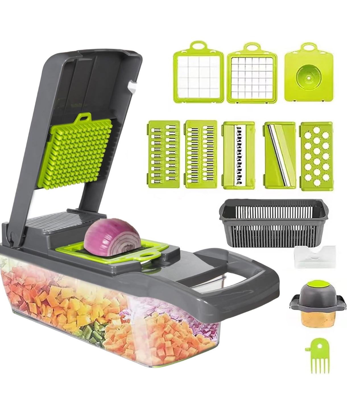 Multi-functional food chopper. Includes multiple interchangeable blades. Great for prepping vegetables quickly. Grey and green colour scheme.