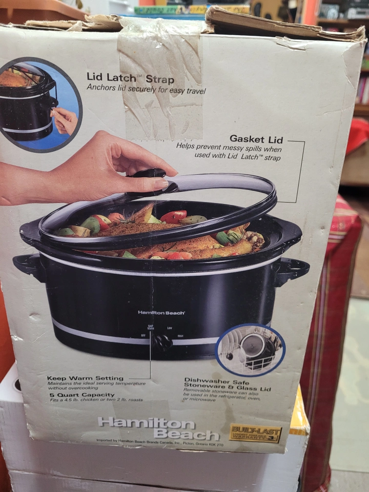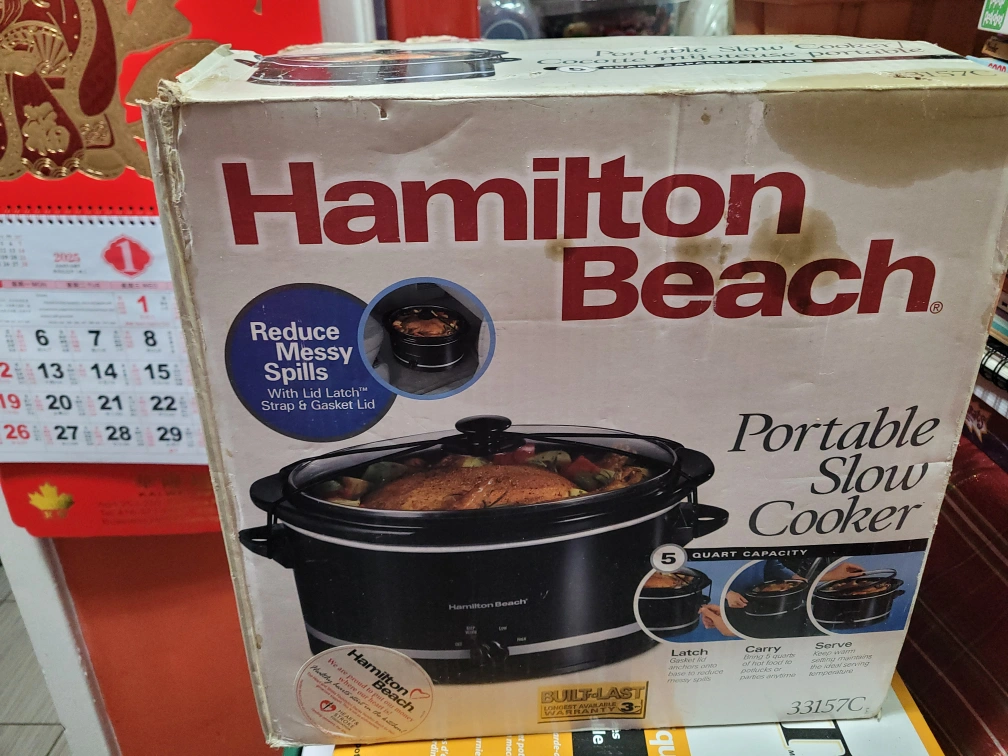 45Vintage Hamilton Beach portable slow cooker. 5-quart capacity. Includes lid latch and gasket lid to reduce spills. Keep warm setting. Dishwasher safe lid and stoneware. Great for travel.