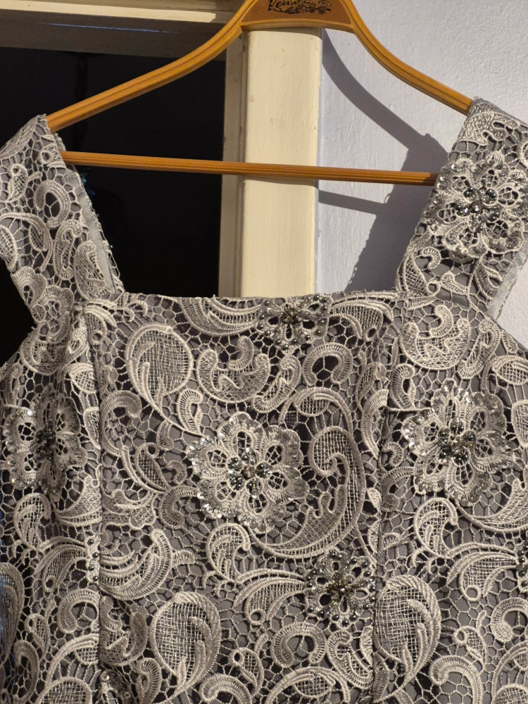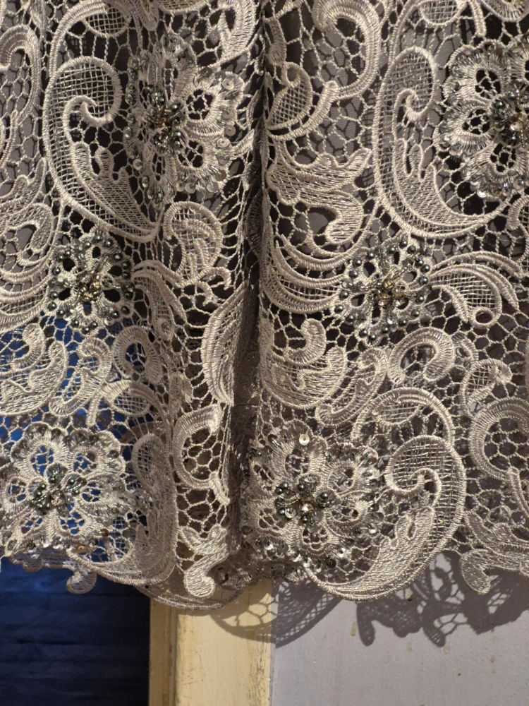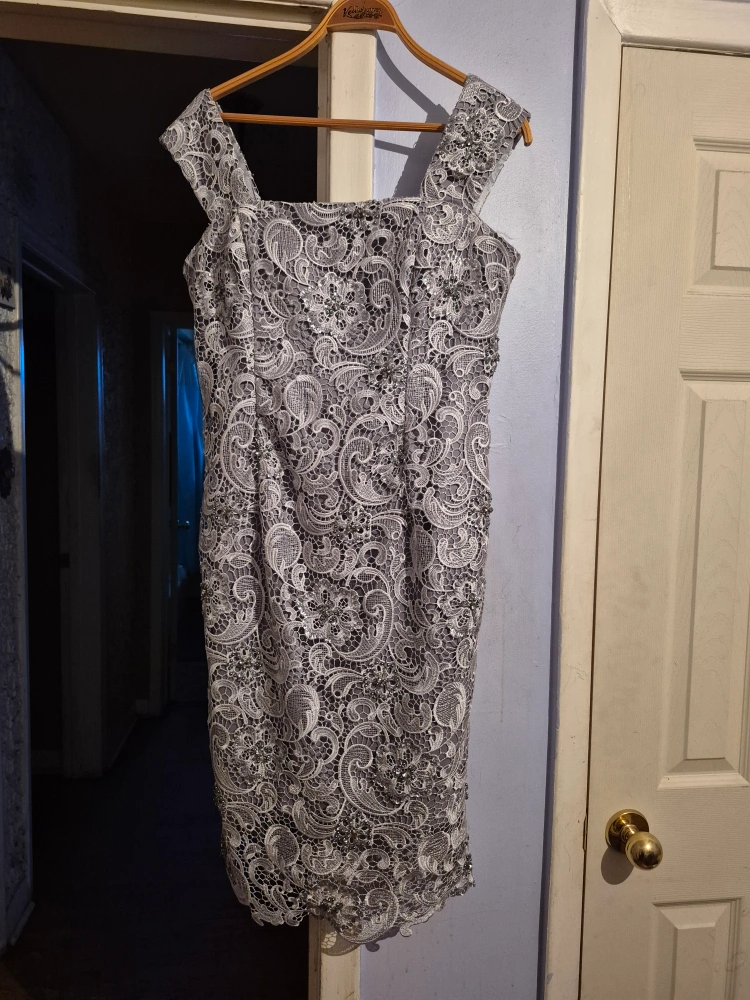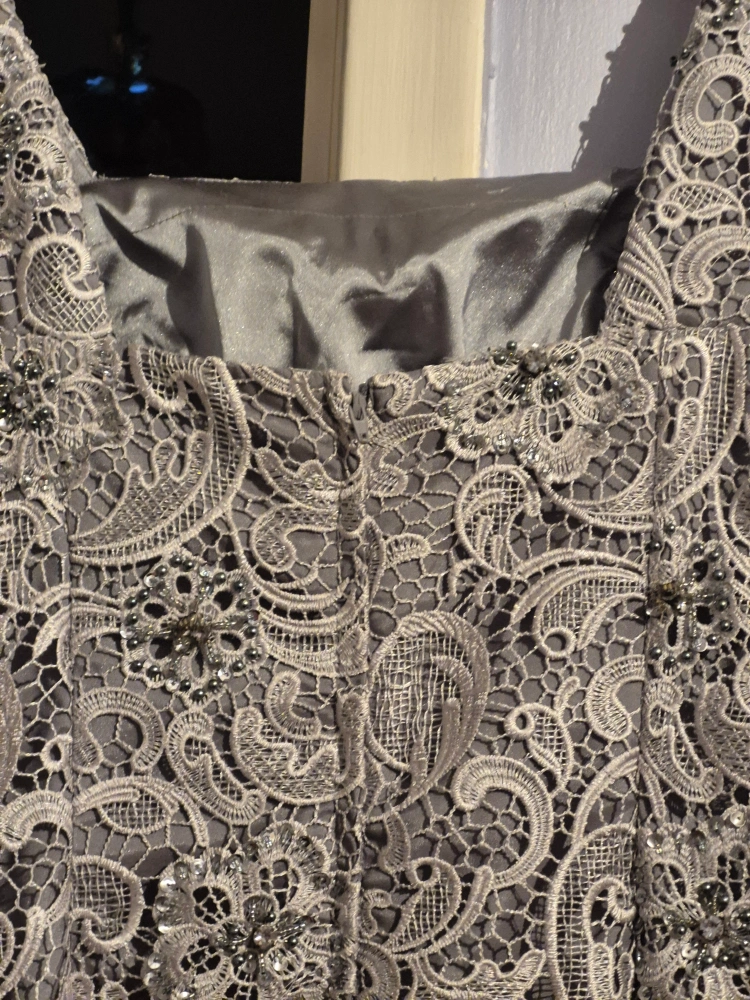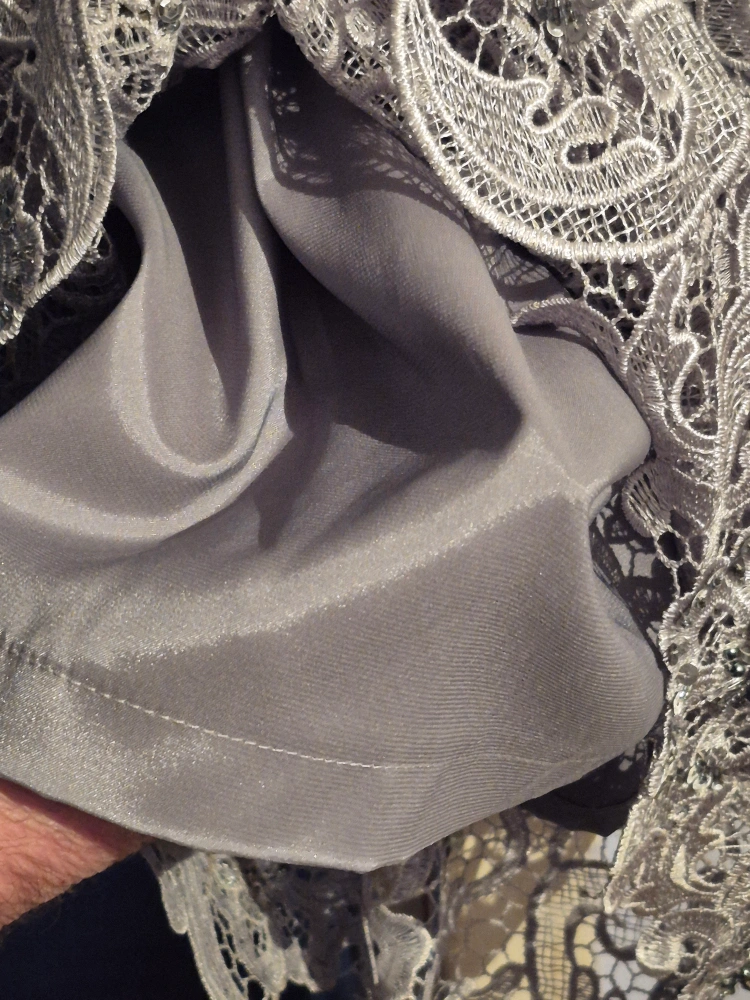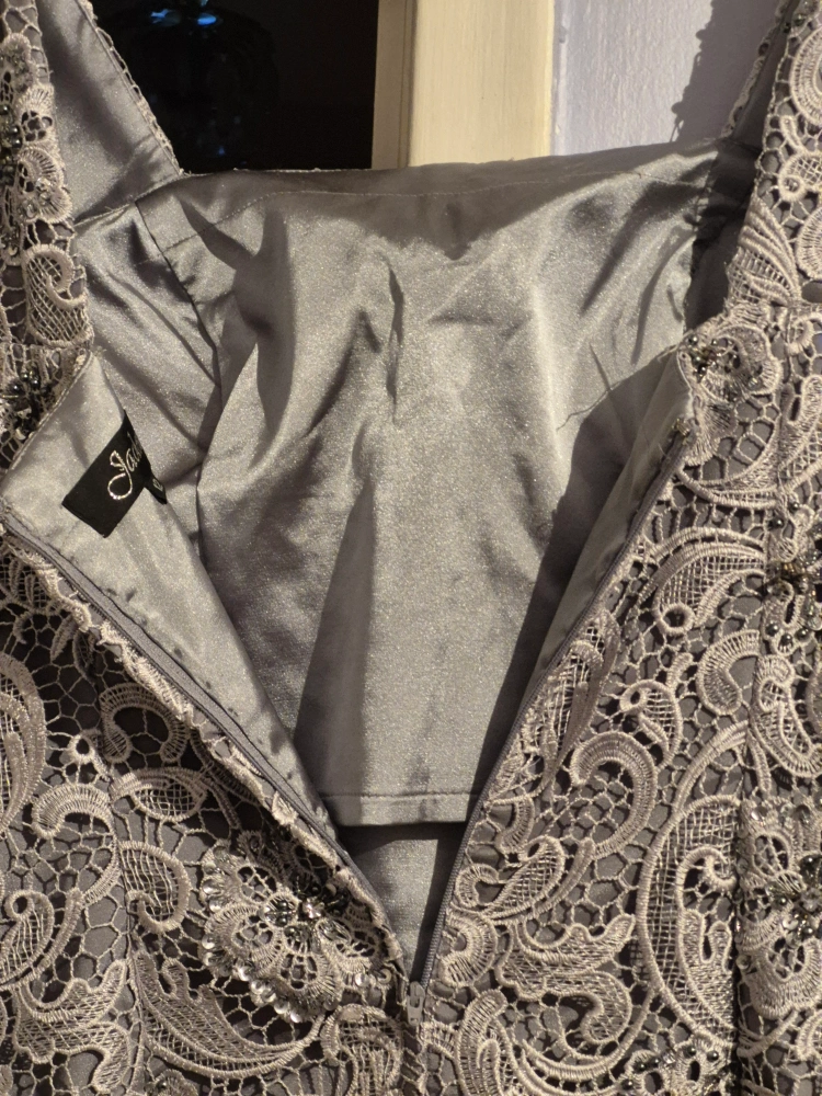 Pre-owned woman's sequin gown, size 12. Built-in silk slip. sequin beads, embroidered lace detailing pretty design. tea Length. zipper sleeve length, wide shoulder straps. Look elegant at any gathering - cocktails, wedding or a night out on the town. no rips, tares, pulling of fabric, well maintained, clean. In Excellent Condition.