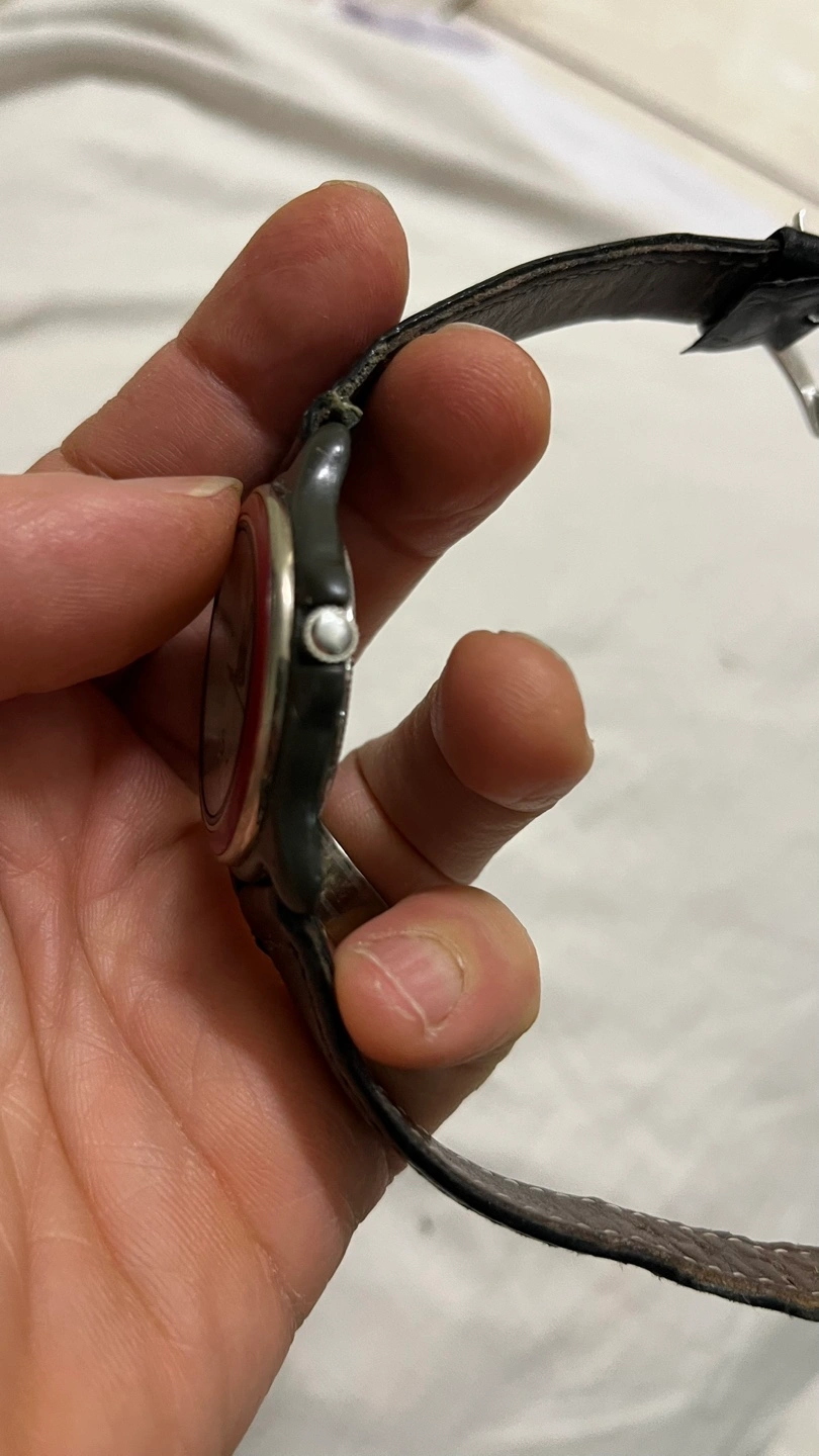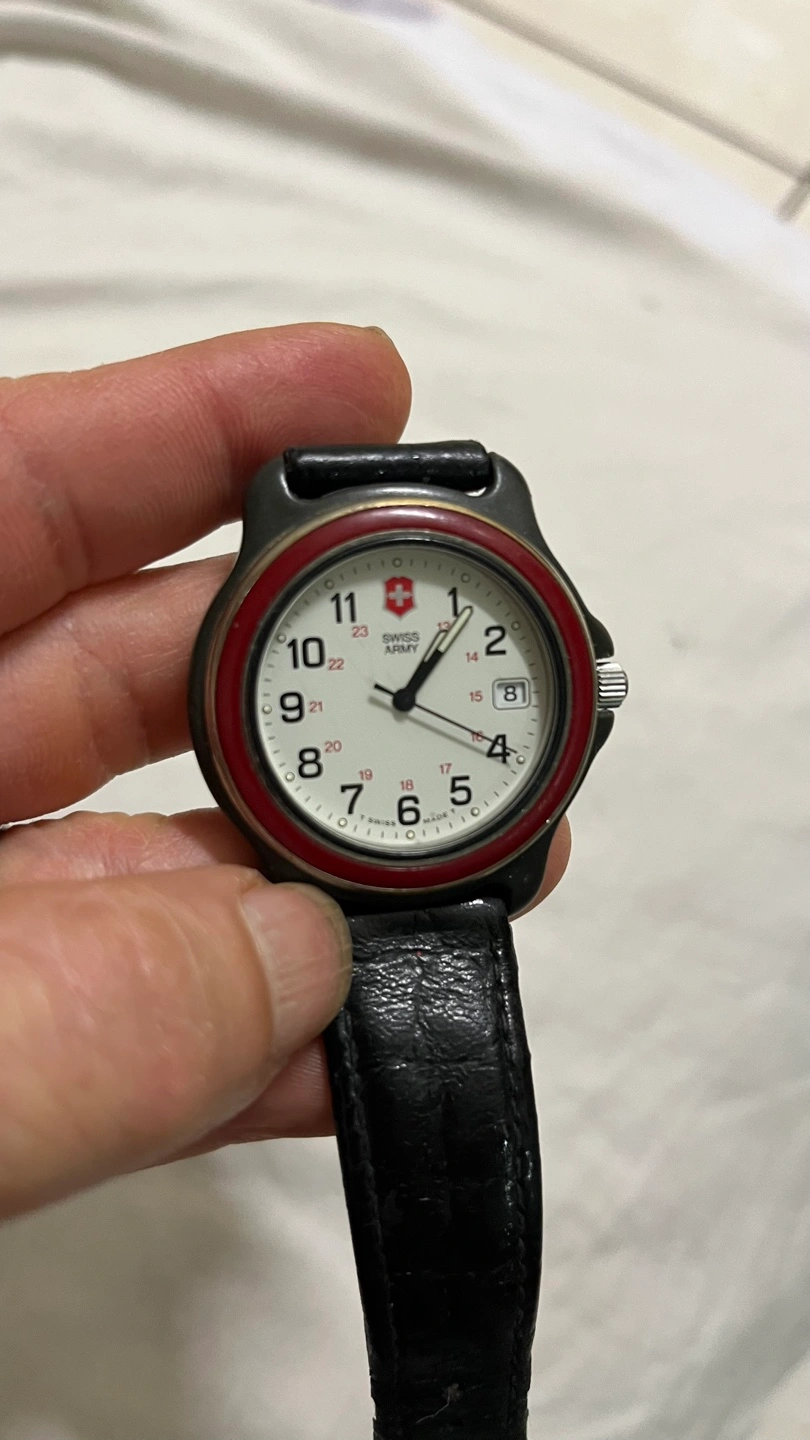 57Classic Swiss Army watch. Black leather band. Round face. Red accents. Pre-owned. Just need a new battery