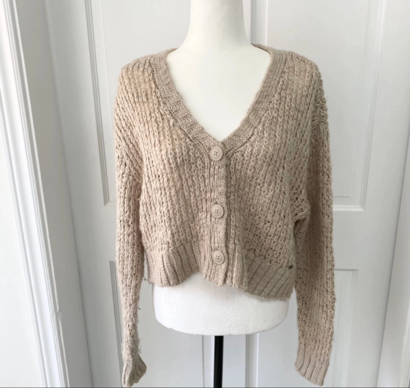 Beige cropped cardigan with long sleeves and a V-neck. Has button closure.