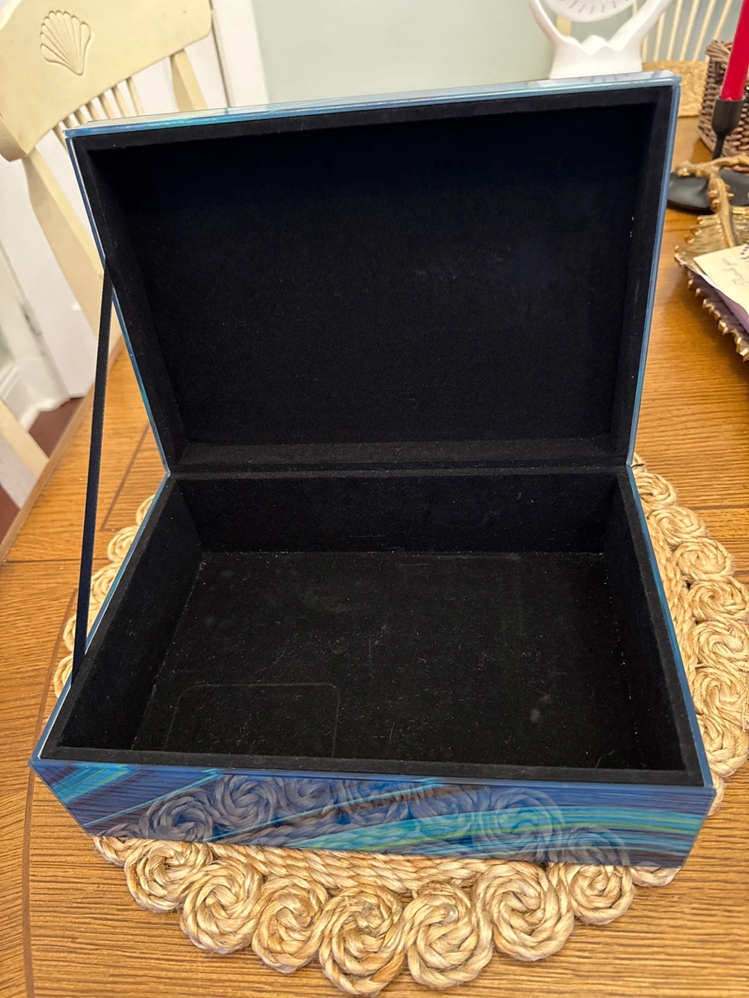 Colourful decorative box with glossy lacquer finish. Features a teal and green marble design. Black velvet interior. Perfect for jewellery or other small items.