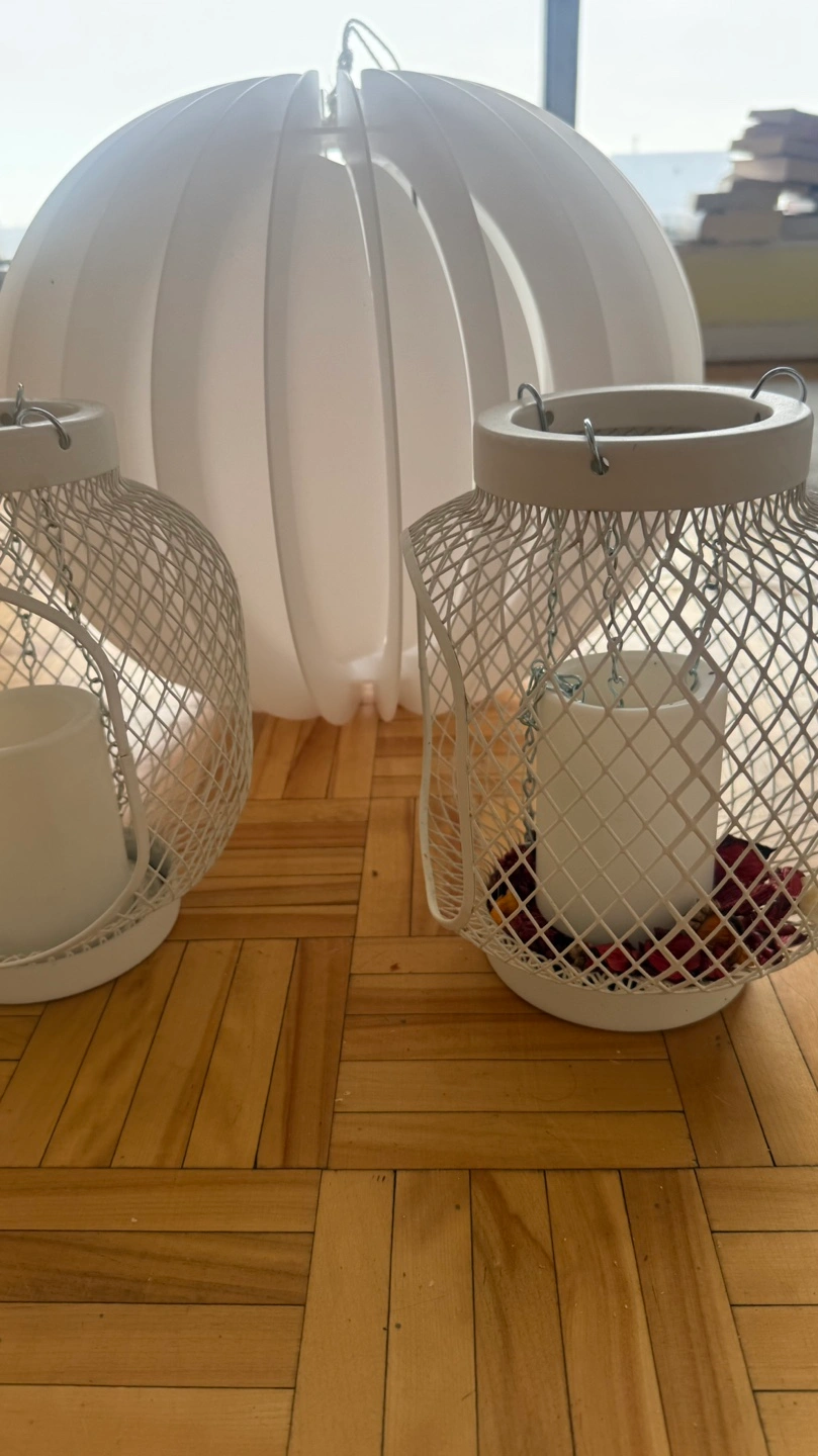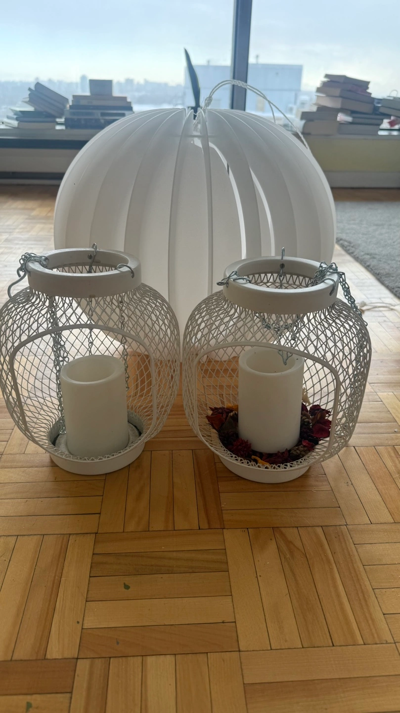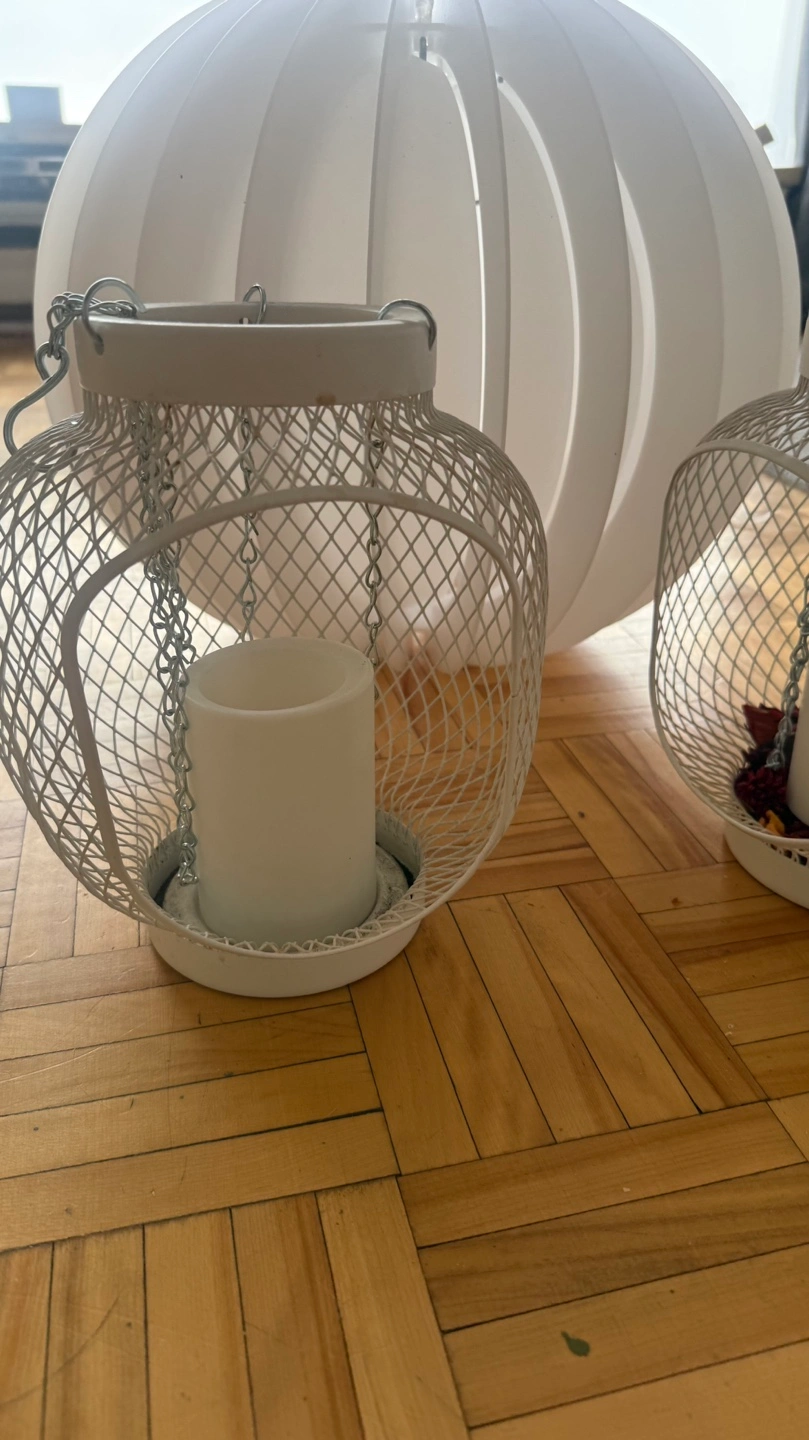 Two small white metal candle lanterns. Each features a wire mesh design and hanging chains. Includes a bonus large white pendant lamp. Perfect for adding ambiance to your home décor.