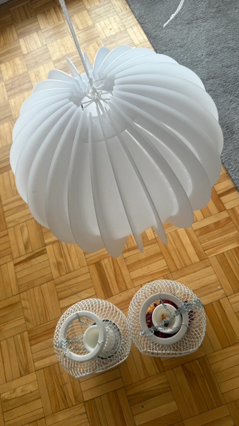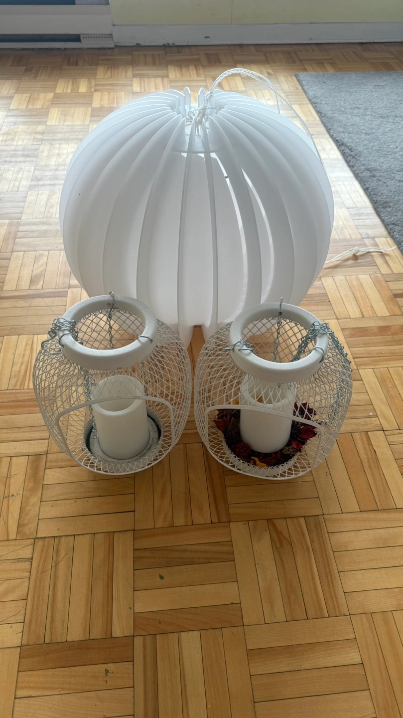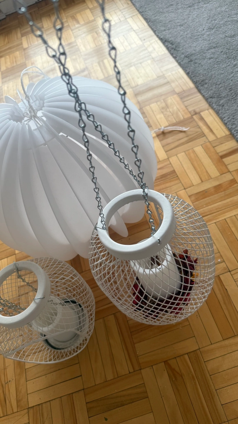 Two small white metal candle lanterns. Each features a wire mesh design and hanging chains. Includes a bonus large white pendant lamp. Perfect for adding ambiance to your home décor.
