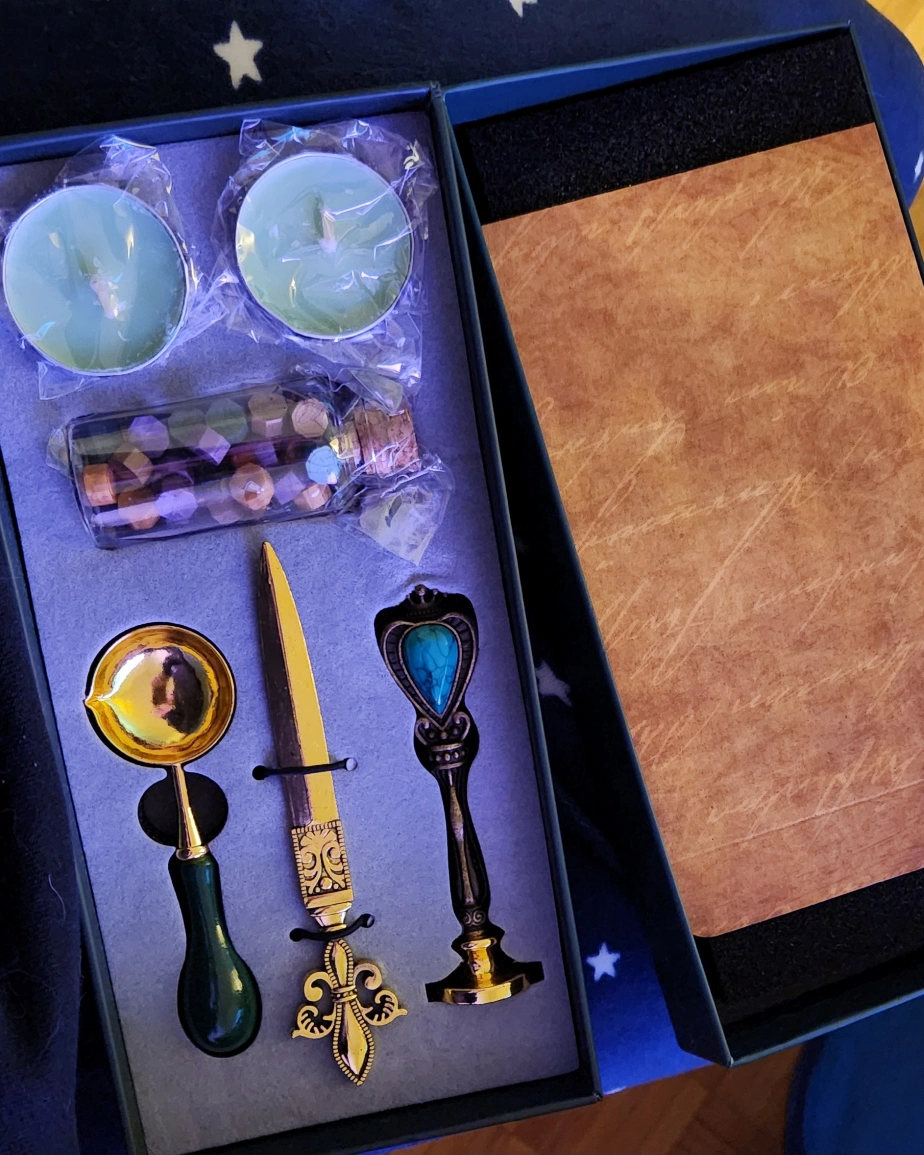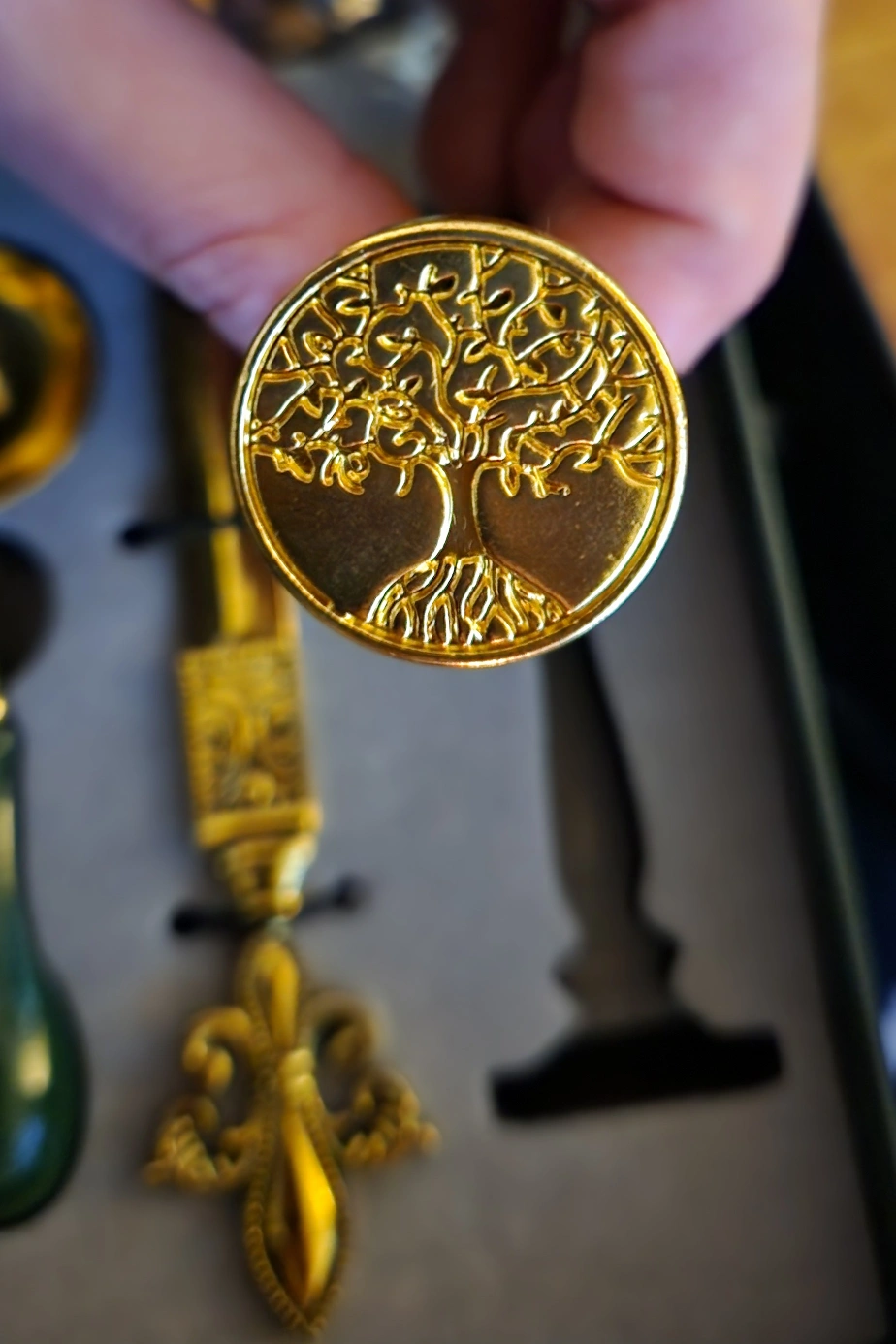 Elegant wax seal kit. Includes two tealight candles, wax beads, a sealing spoon, a knife, and a gold-toned stamp with a tree of life design. Perfect for adding a touch of vintage charm to your letters or invitations. Comes in a decorative box. #declutterchallenge cawthra and lakeshore