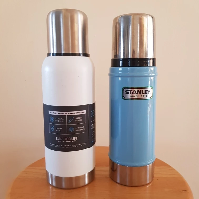1000+Pair of Stanley vacuum bottles. Stainless steel. Keeps drinks hot or cold. Great for camping or everyday use. The white one (25 oz) is brand new and never used. The blue one (16 oz) is in good condition. Price listed is for both bottles. Cash only Pickup near or at Cornell Public Library, or Delivery to Markham, Pickering, or Stouffville