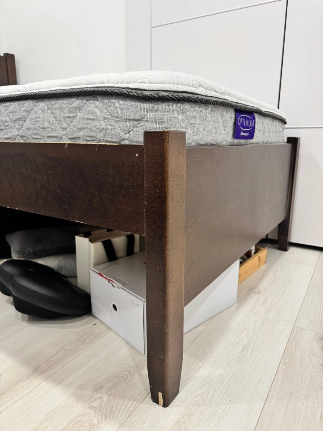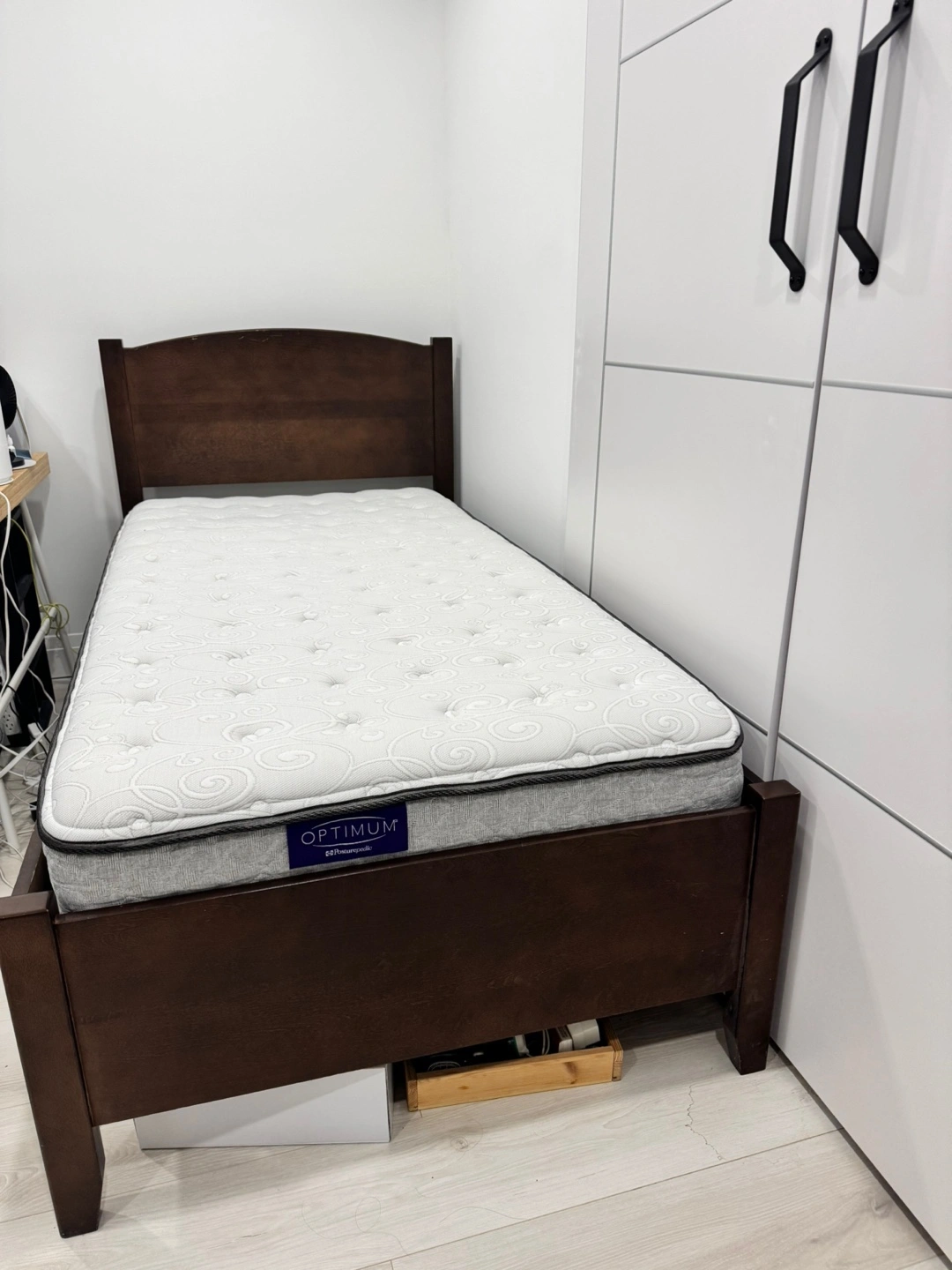 Dark brown wooden single bed frame. Minor scratches on headboard and footboard. Excellent condition otherwise. Perfect for a child's room or guest room.