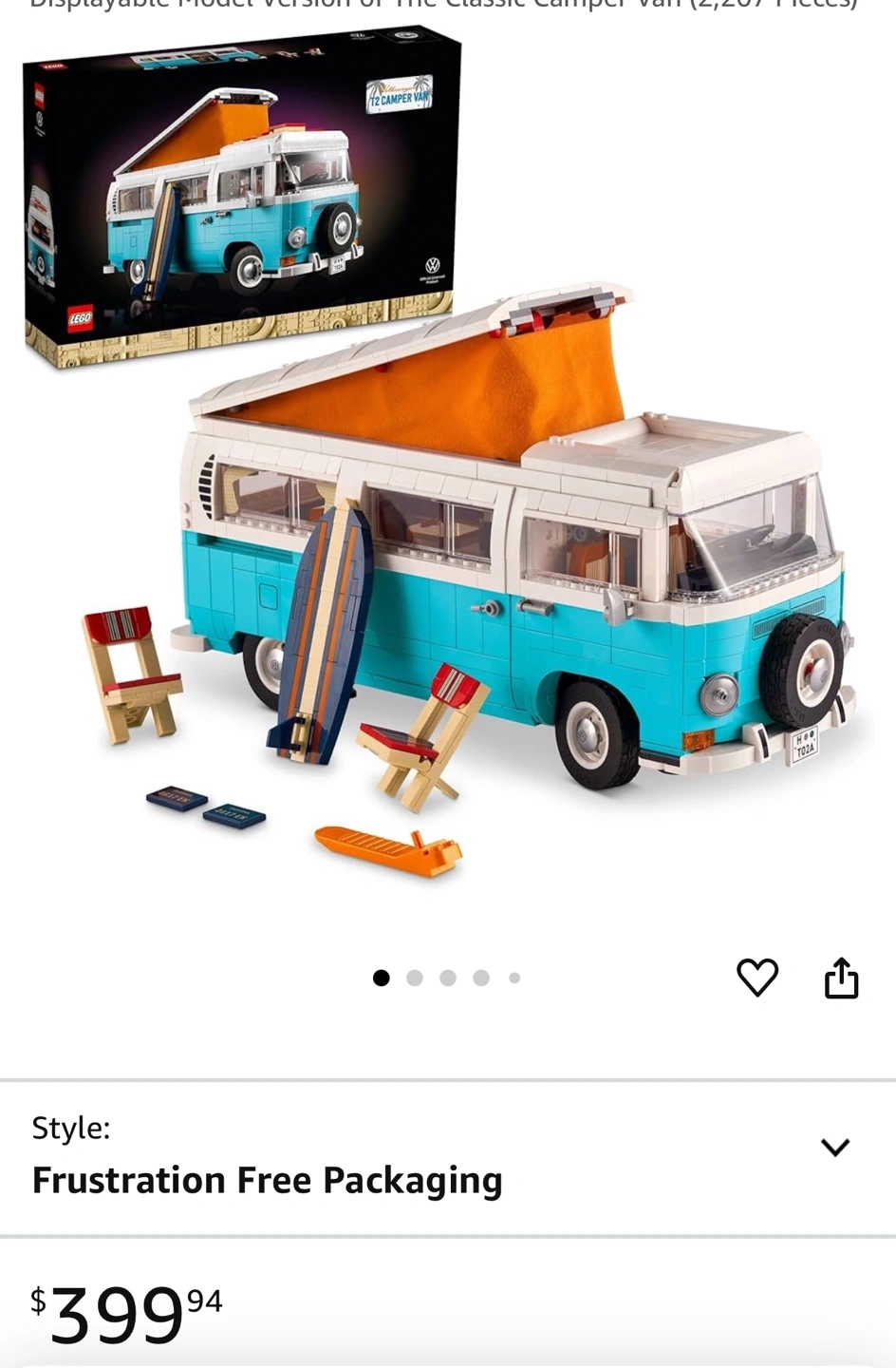 LEGO Creator Expert Volkswagen T2 Camper Van building set. 2,207 pieces. Includes surfboard, camping chairs, and other accessories. Box and manual available