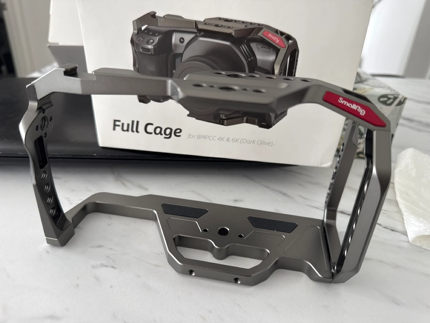 Full cage for Blackmagic Design Pocket Cinema Camera 4K & 6K. Features cold shoe mount, NATO rail, and various thread mounts. Dark olive colour. New condition.