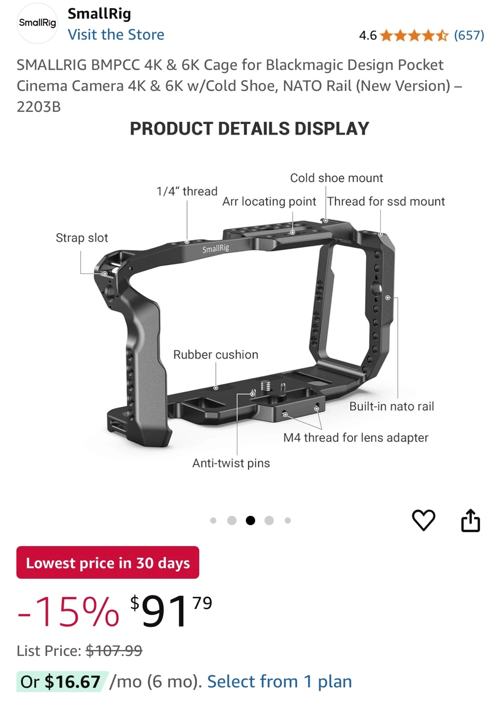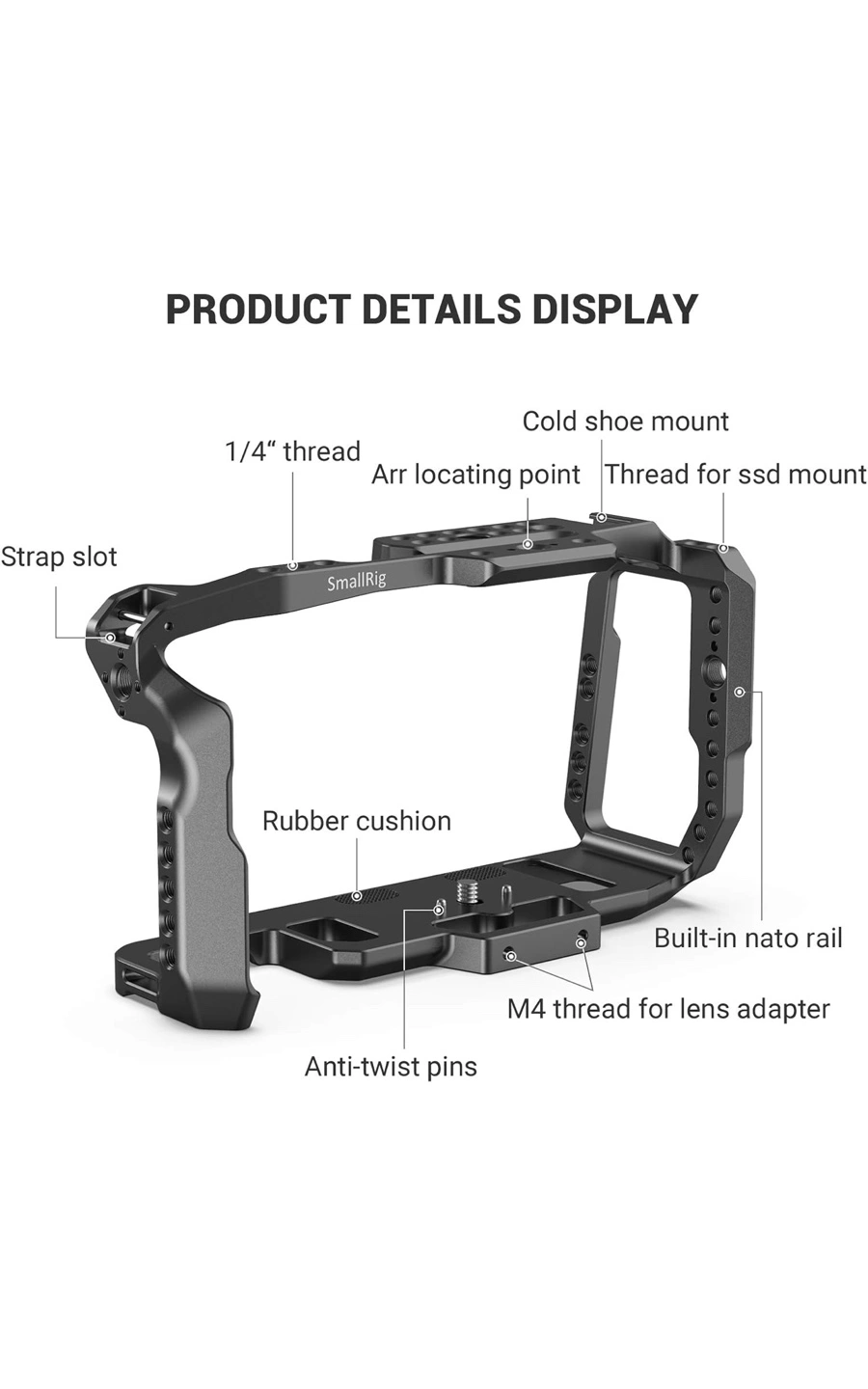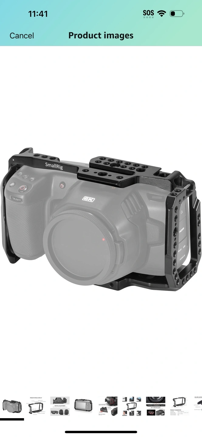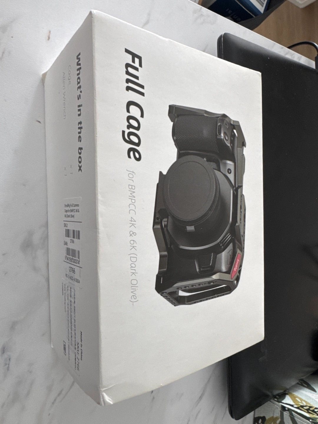 Full cage for Blackmagic Design Pocket Cinema Camera 4K & 6K. Features cold shoe mount, NATO rail, and various thread mounts. Dark olive colour. New condition.