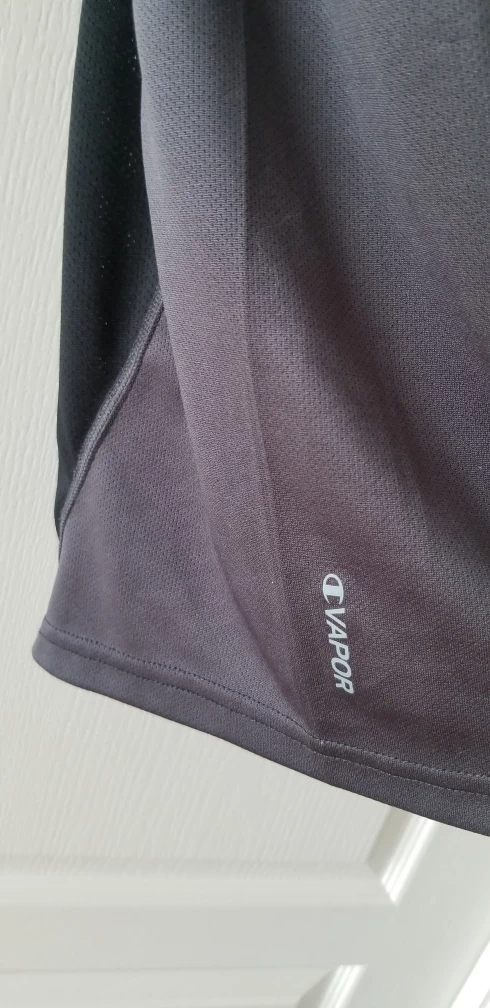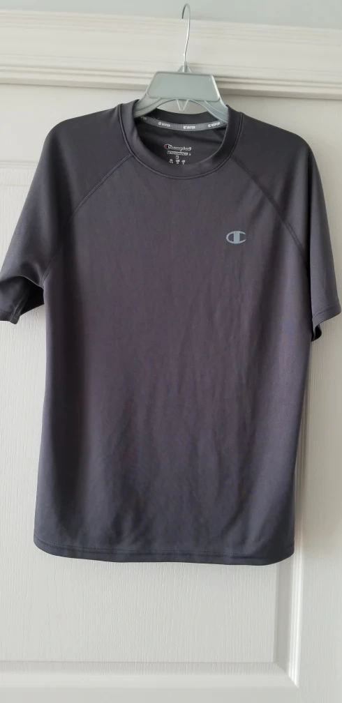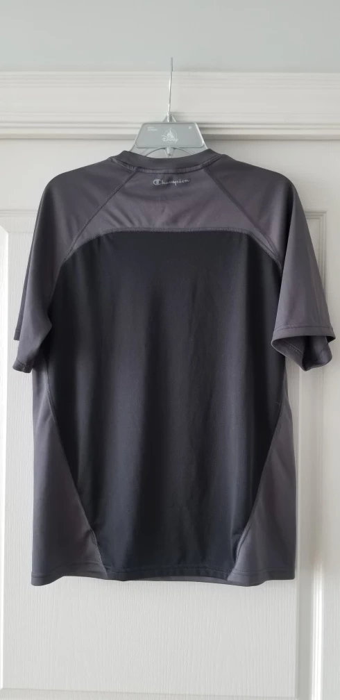 Grey and black Champion performance t-shirt. Short sleeves, crew neck. Moisture-wicking fabric. Size Medium.