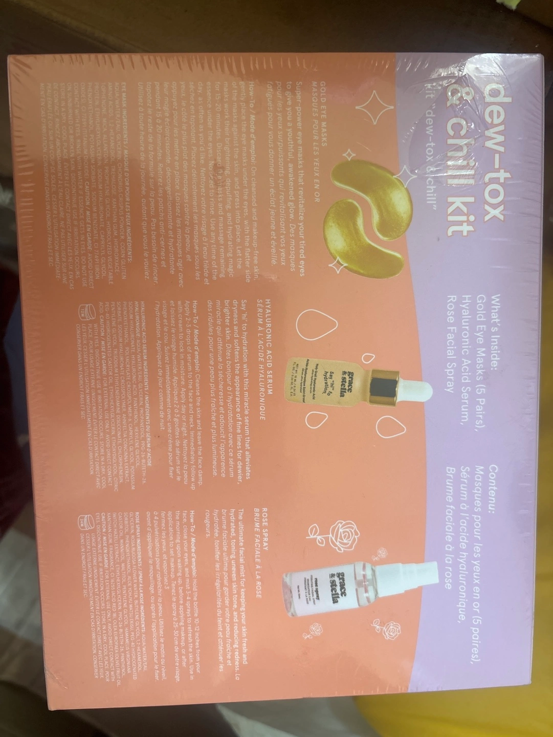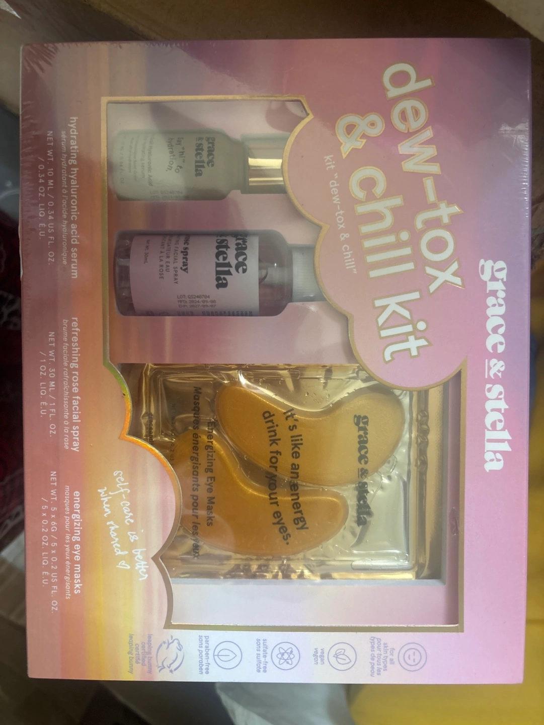 New Grace & Stella Dew-Tox & Chill Kit. Includes eye masks, hyaluronic acid serum, and facial spray. Perfect for a relaxing skincare routine.