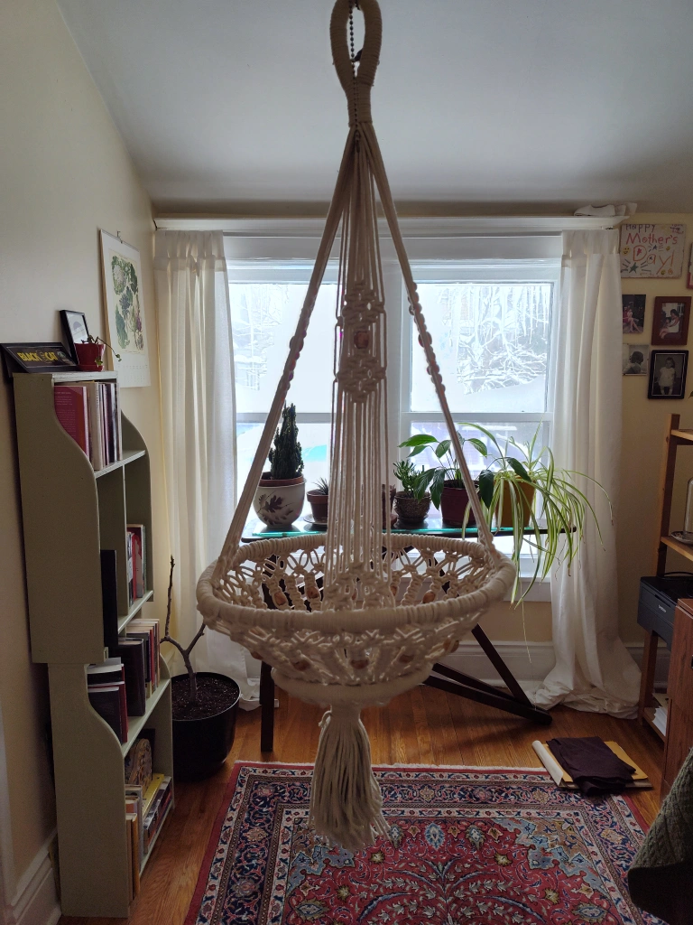 Unique macrame hanging planter. Features a woven basket and decorative tassels. Perfect for plants or other decorative items. Hand-crafted, bohemian style.