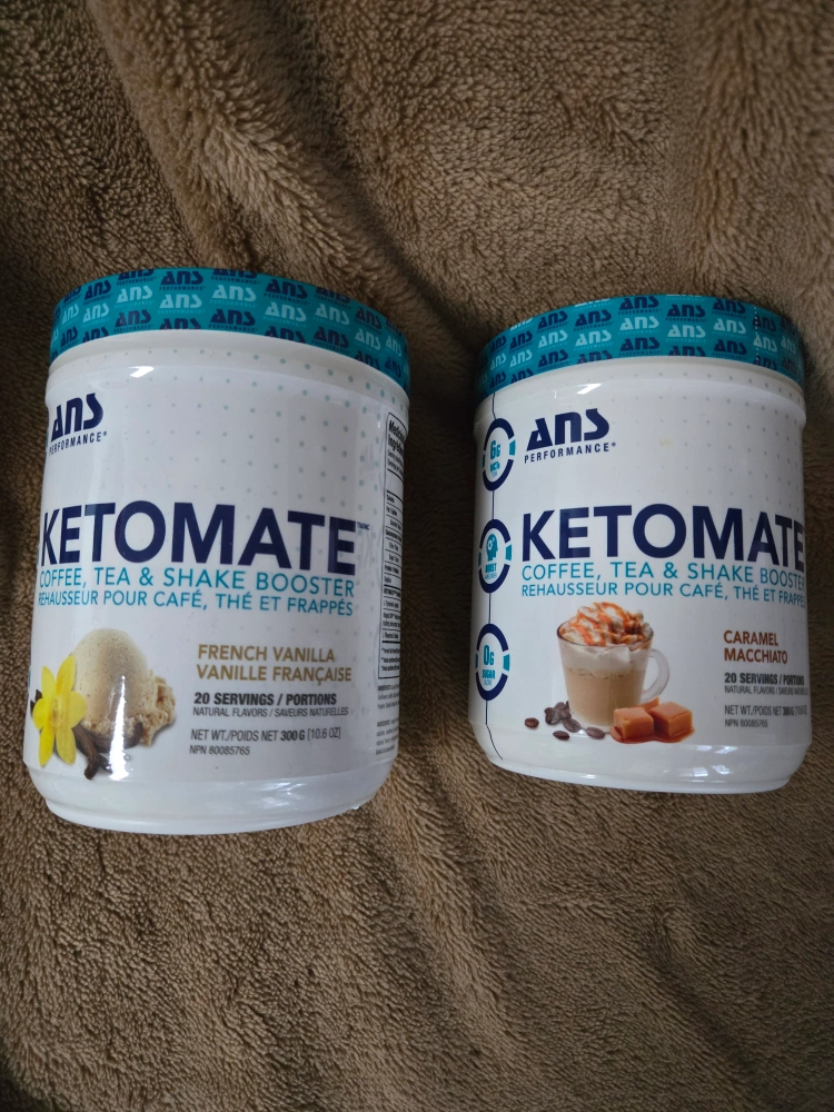 Two tubs of ANS Performance KetoMate. One French Vanilla, one Caramel Macchiato. Coffee, tea & shake booster. 20 servings per tub.