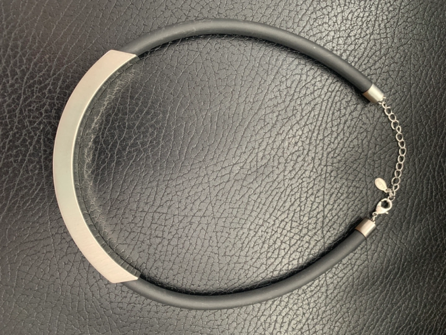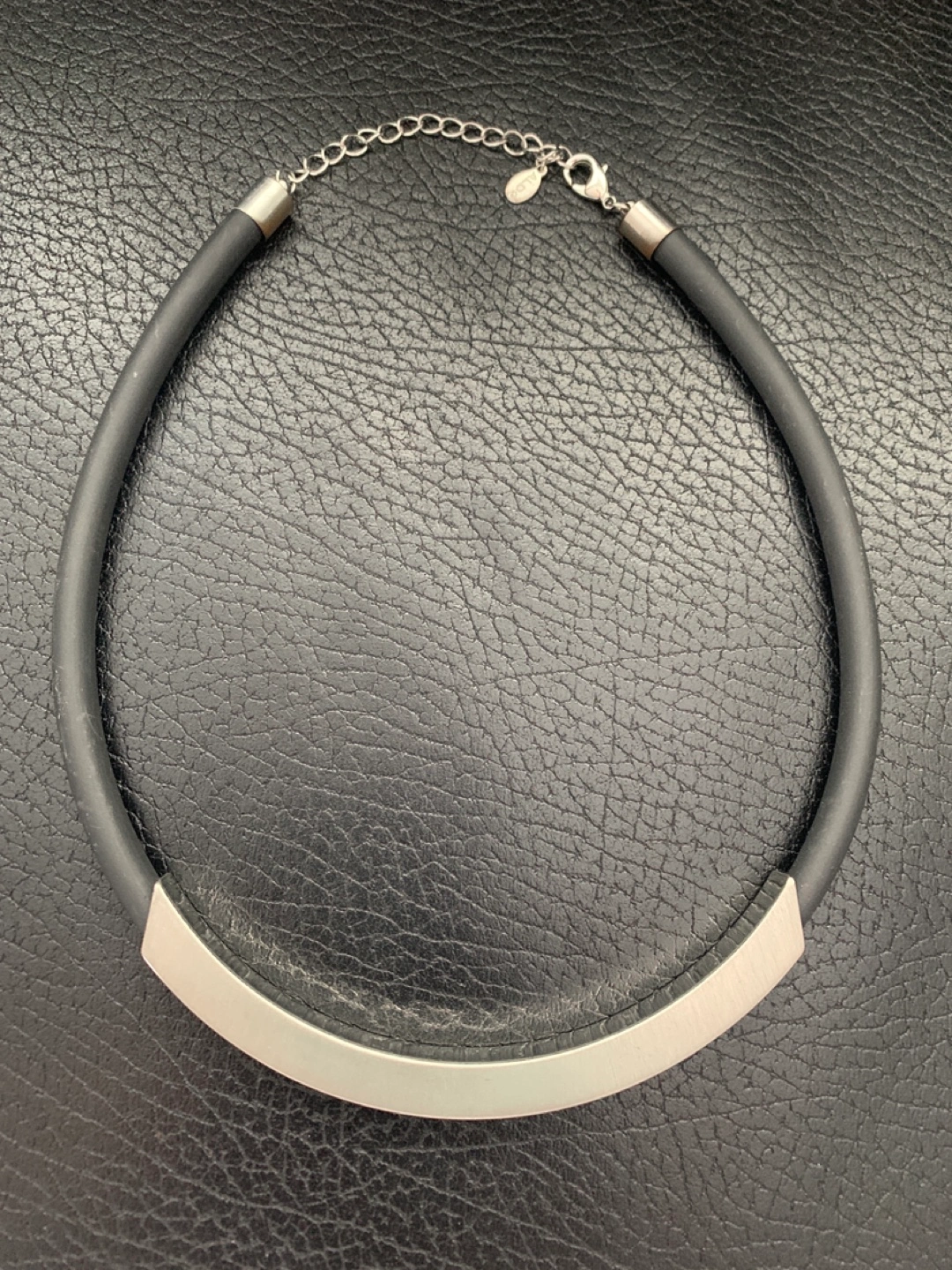 Unique statement piece. Features a curved silver toned metal accent and black silicone band. Secure clasp closure.