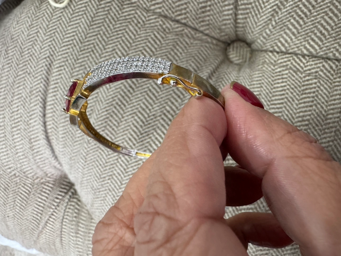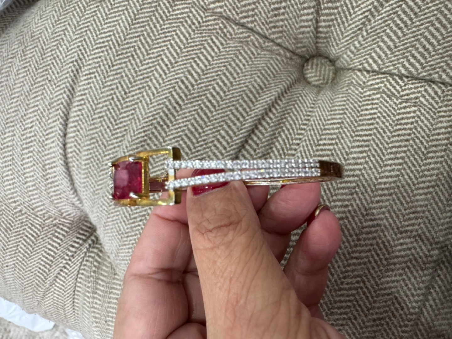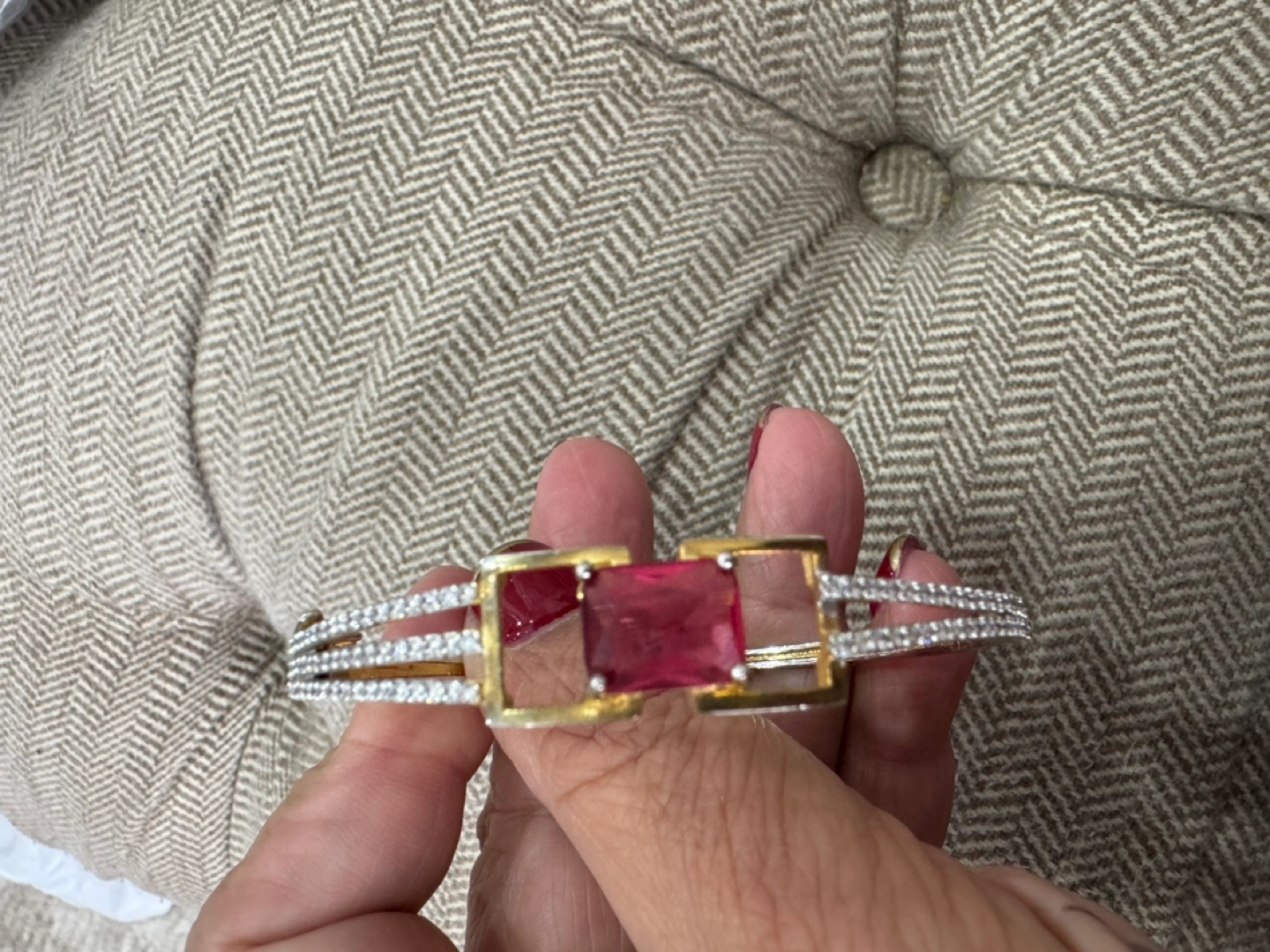 Stunning bracelet. Features a large red gemstone framed in gold. Accented with small diamonds. Gold clasp. Elegant and eye-catching.