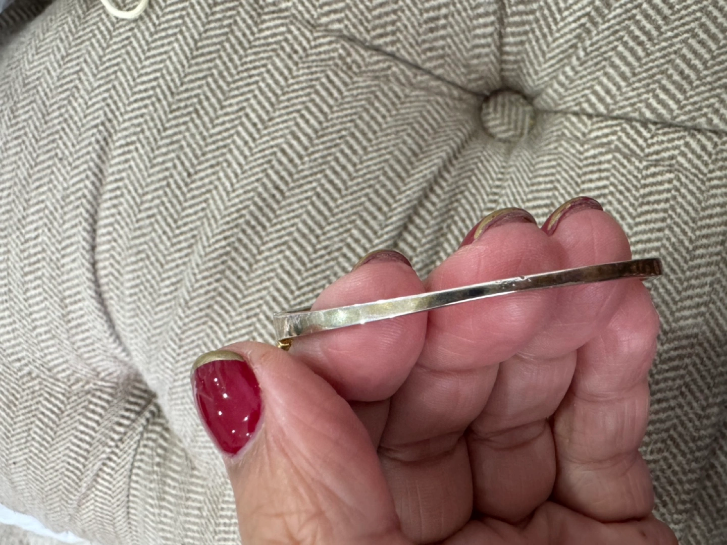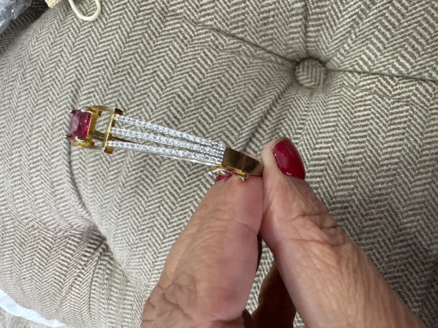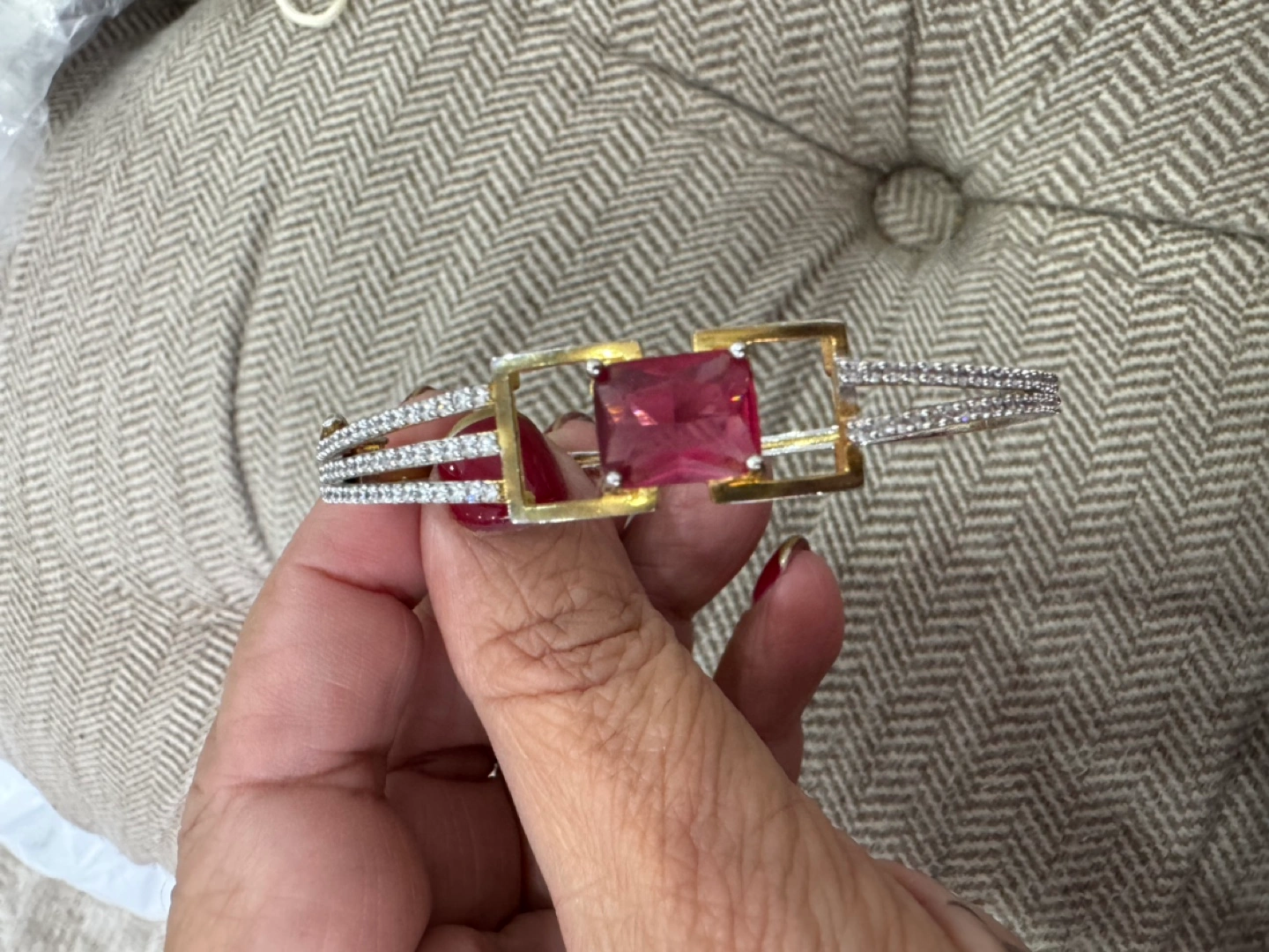 Stunning bracelet. Features a large red gemstone framed in gold. Accented with small diamonds. Gold clasp. Elegant and eye-catching.