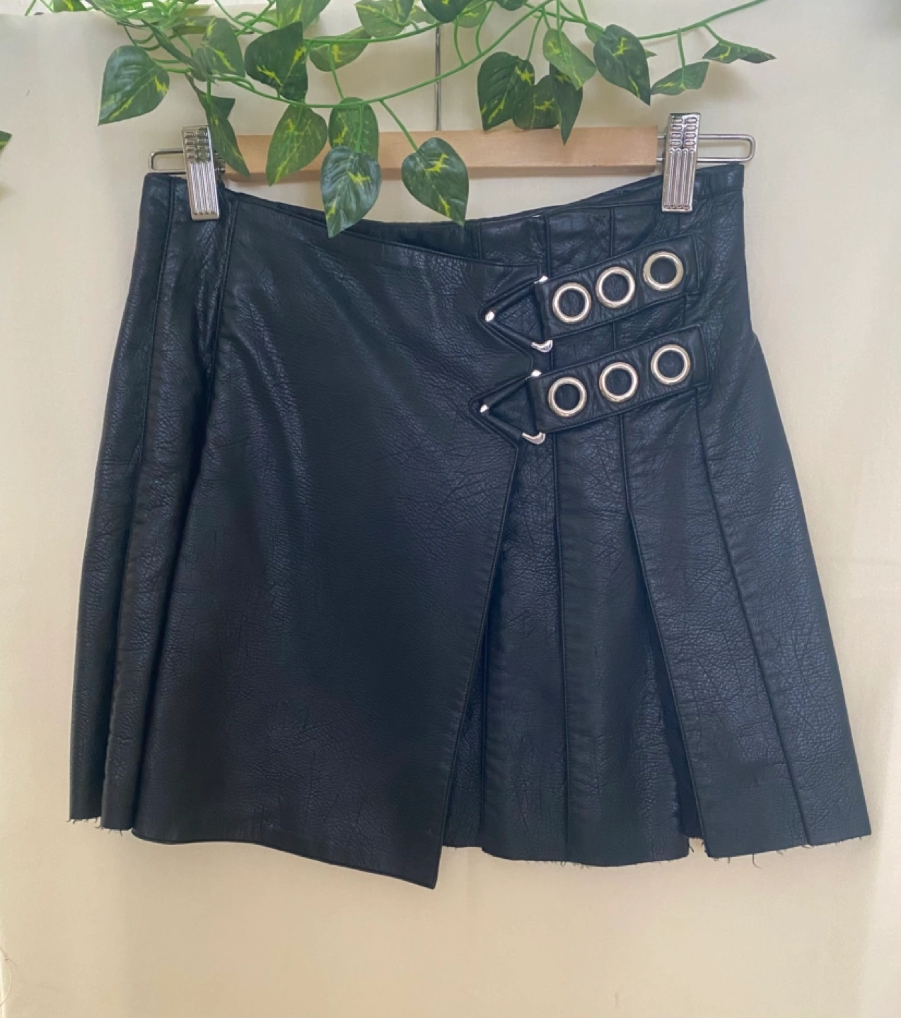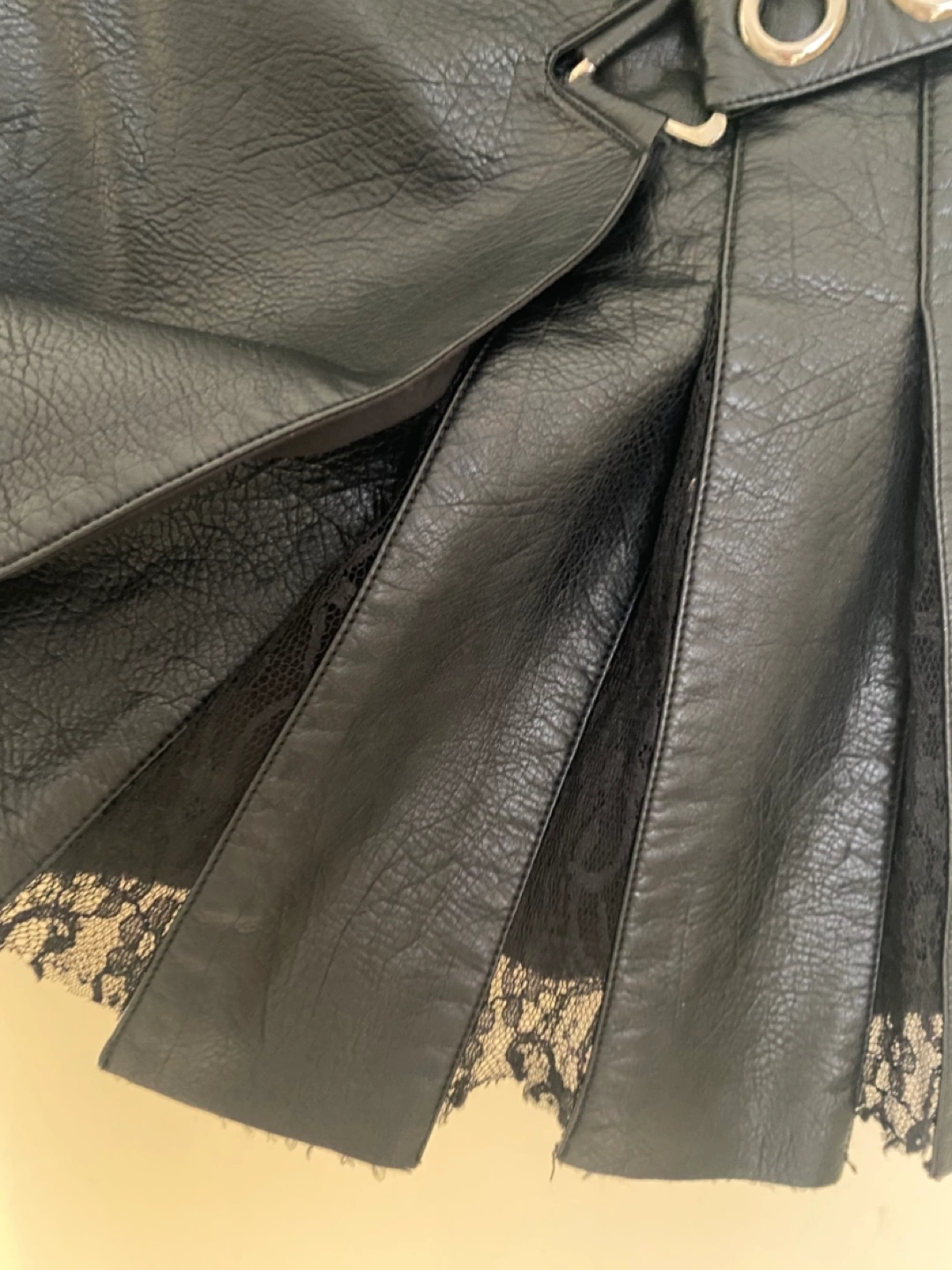 Black faux leather mini skirt. Features pleated design and silver buckles. Cute lace detailing in between pleats. Size Medium.