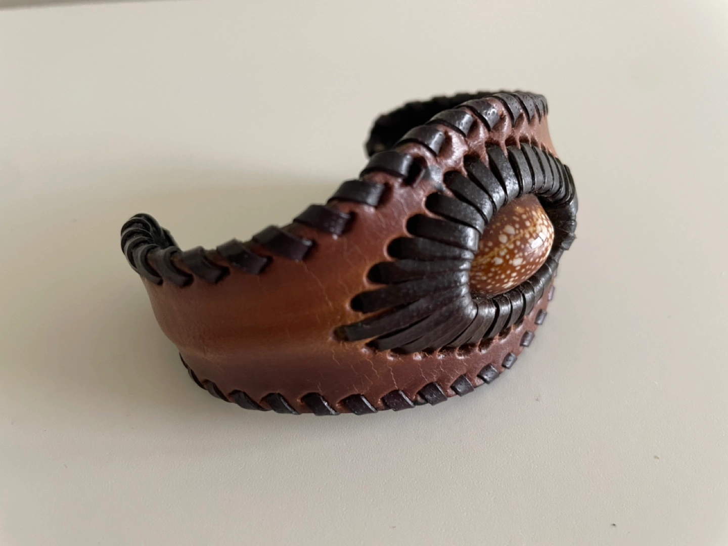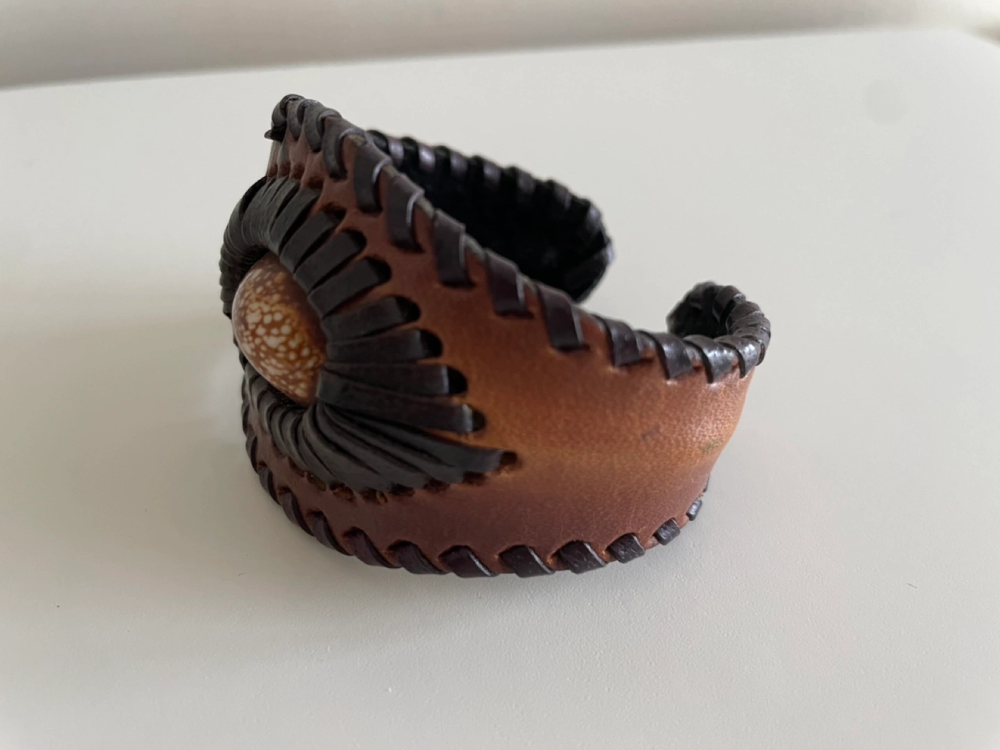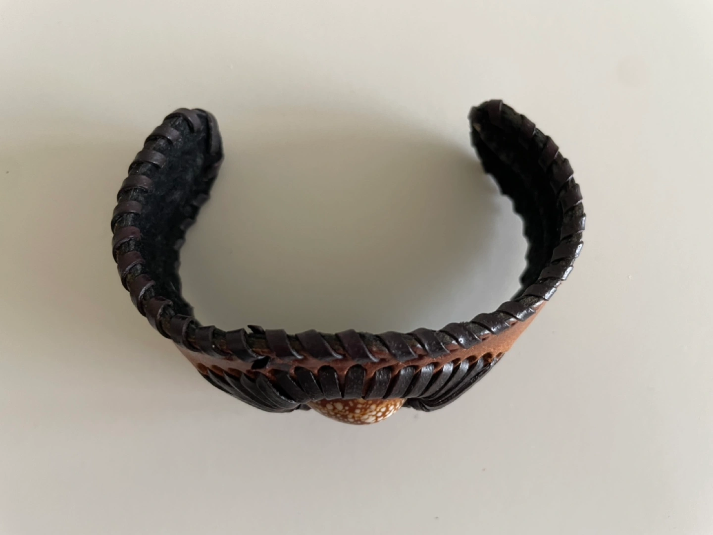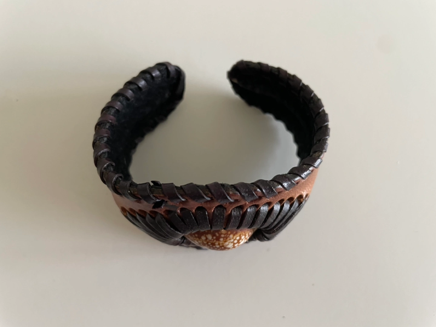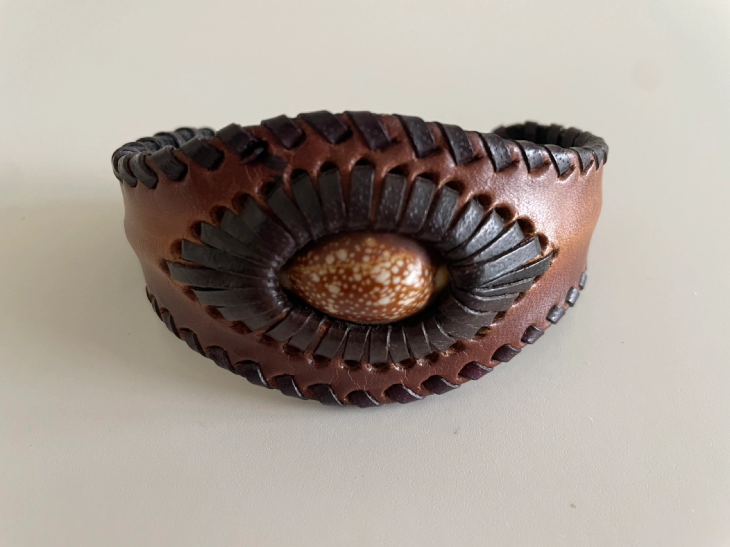 Unique handmade leather cuff bracelet. Features a woven design and a shell accent. Brown and dark brown leather. Adjustable sizing.