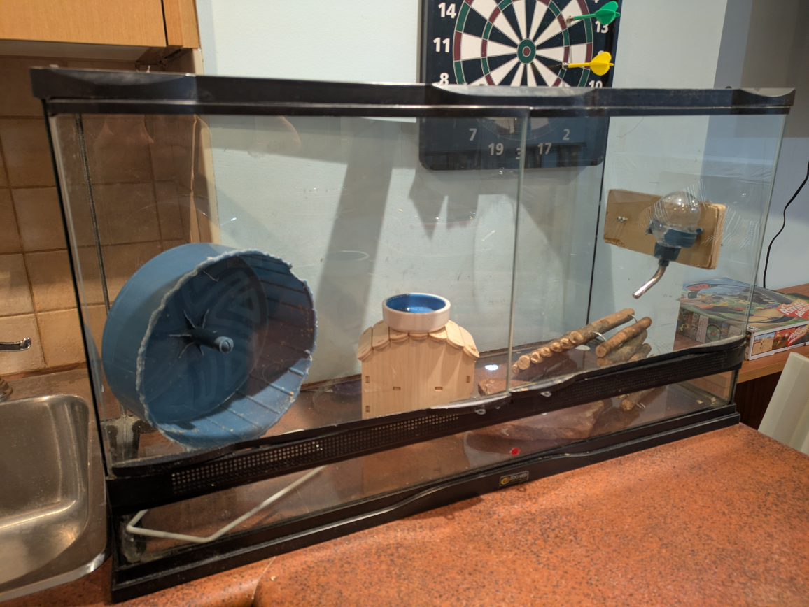 My son has a 40 gallon tank with front opening doors. Plus bedding, water and food bowl for gerbils.