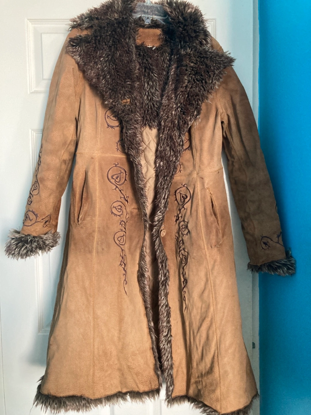 Long suede coat, brown colour. Features faux fur trim on the collar and cuffs. Embroidered detailing on the front. Size 8.