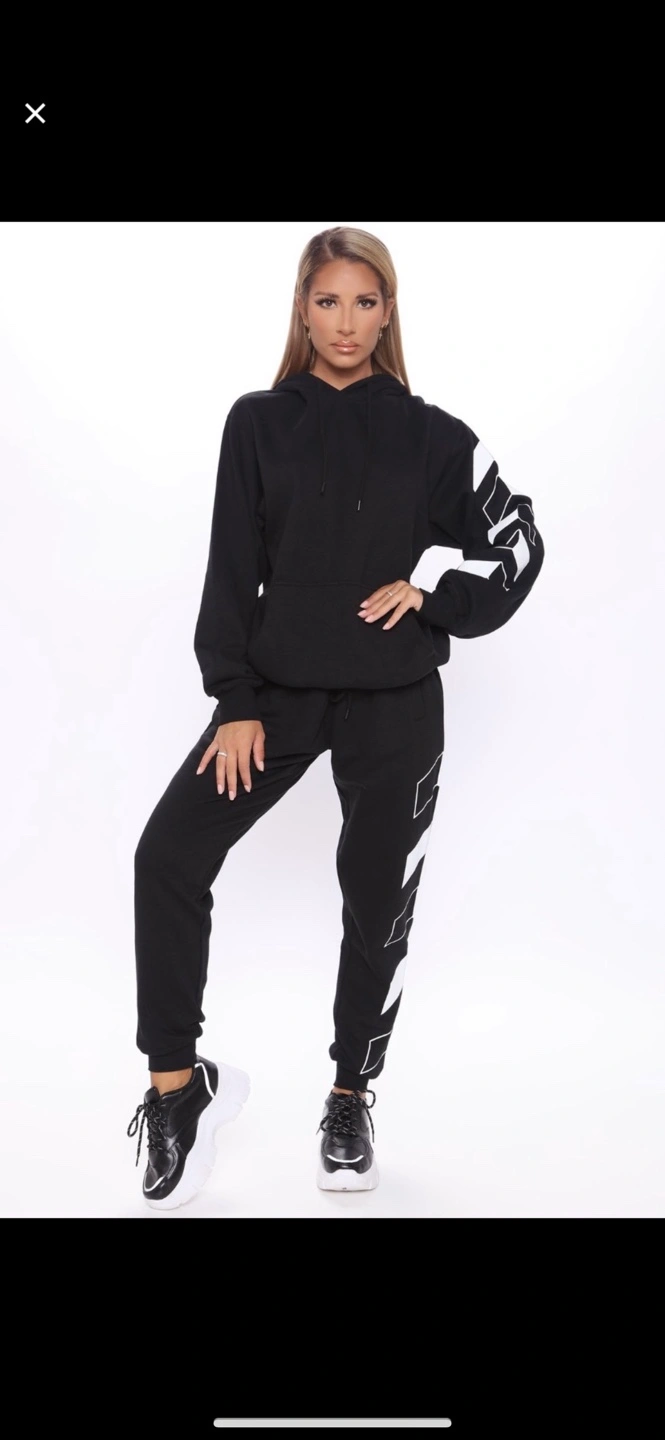 Stylish black hoodie and jogger set. Features white graphic detailing on sleeves and pant legs. Comfortable and fashionable, perfect for casual wear. Size small.