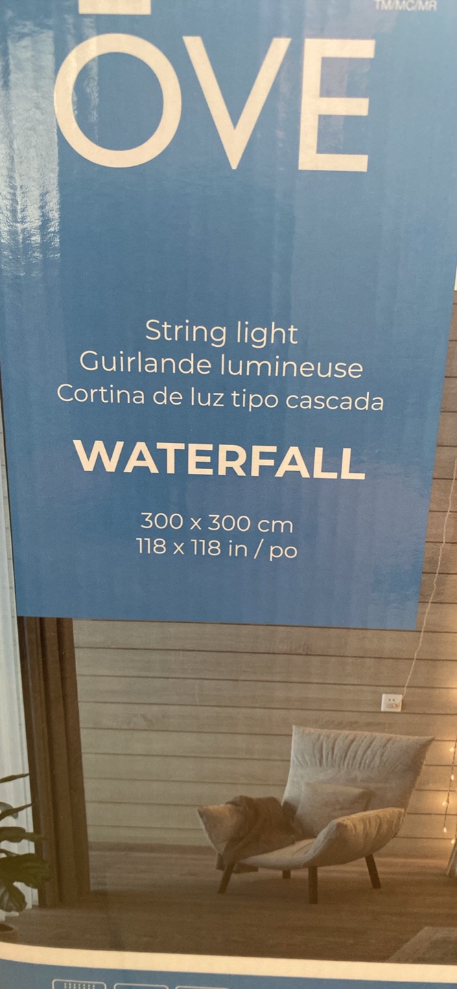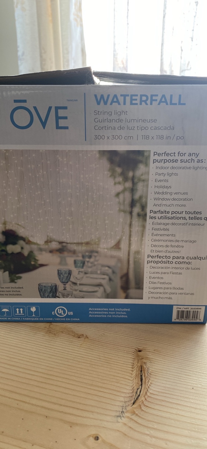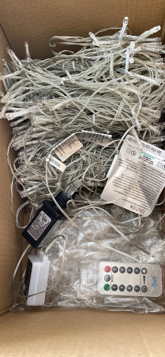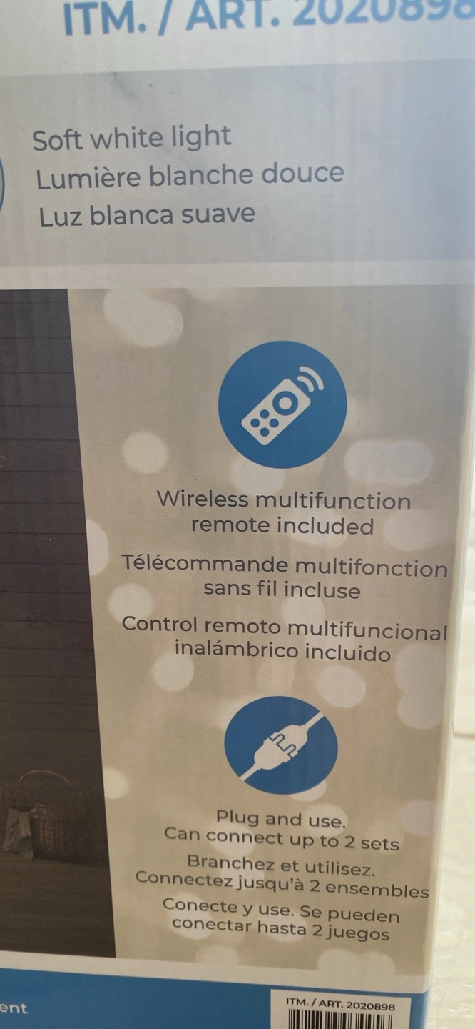 New in box. Soft white LED string lights. Wireless multifunction remote included. Connects up to 2 sets. Ideal for parties, weddings, and more. 118 inches by 118 inches.