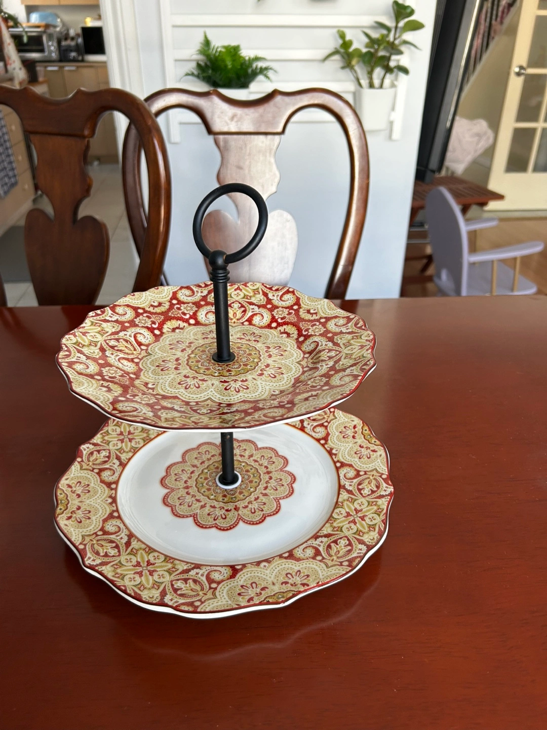 Beautiful two-tiered serving stand. Features a red and gold paisley design. Metal stand. Perfect for parties or afternoon tea.