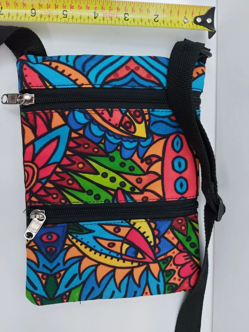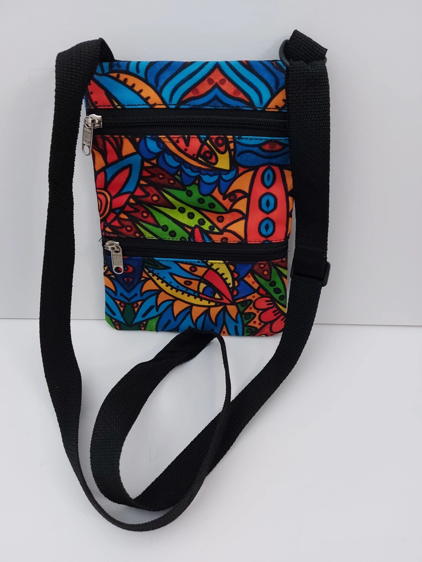Vibrant colourful patterned fabric. Two zippered compartments. Adjustable shoulder strap. Lightweight and compact.