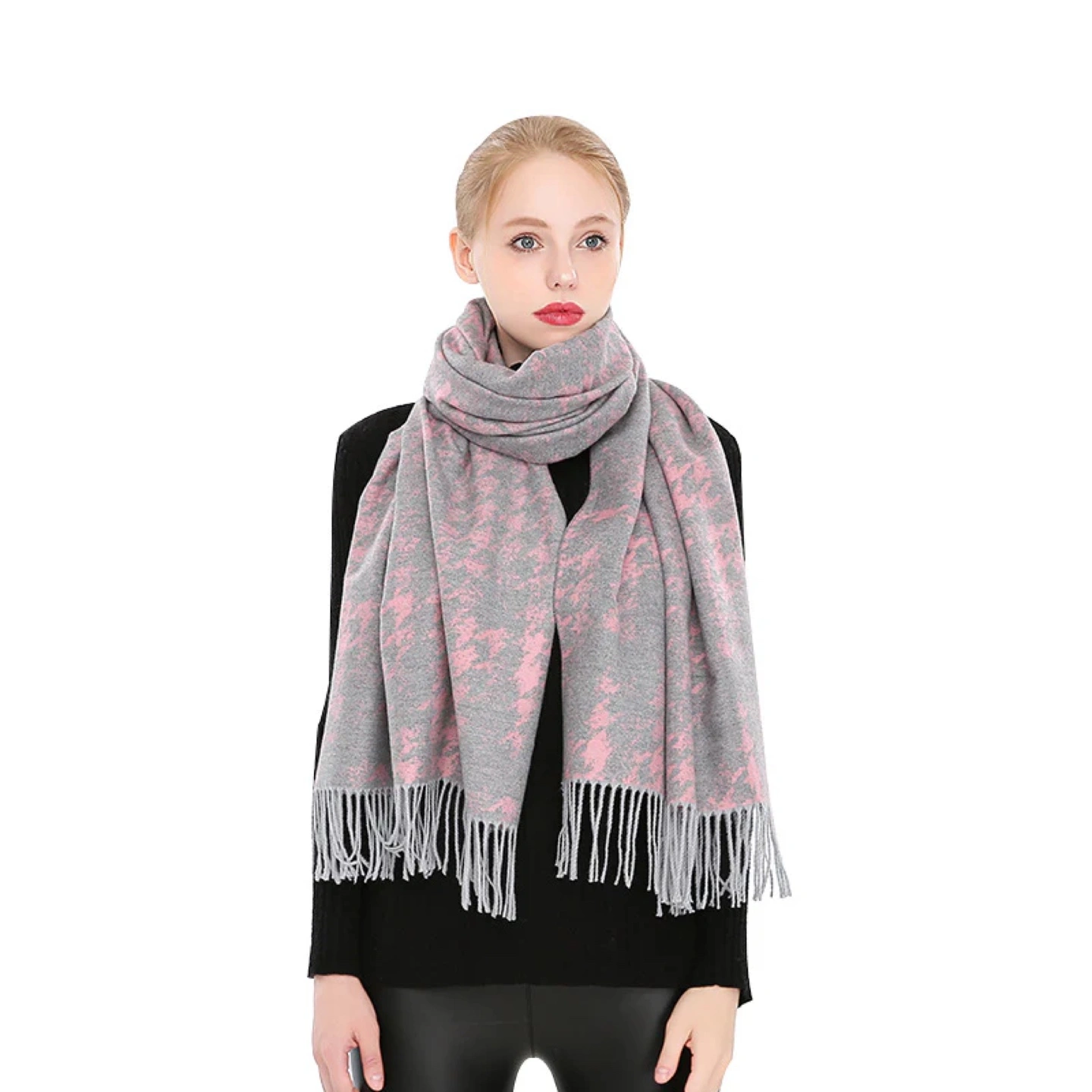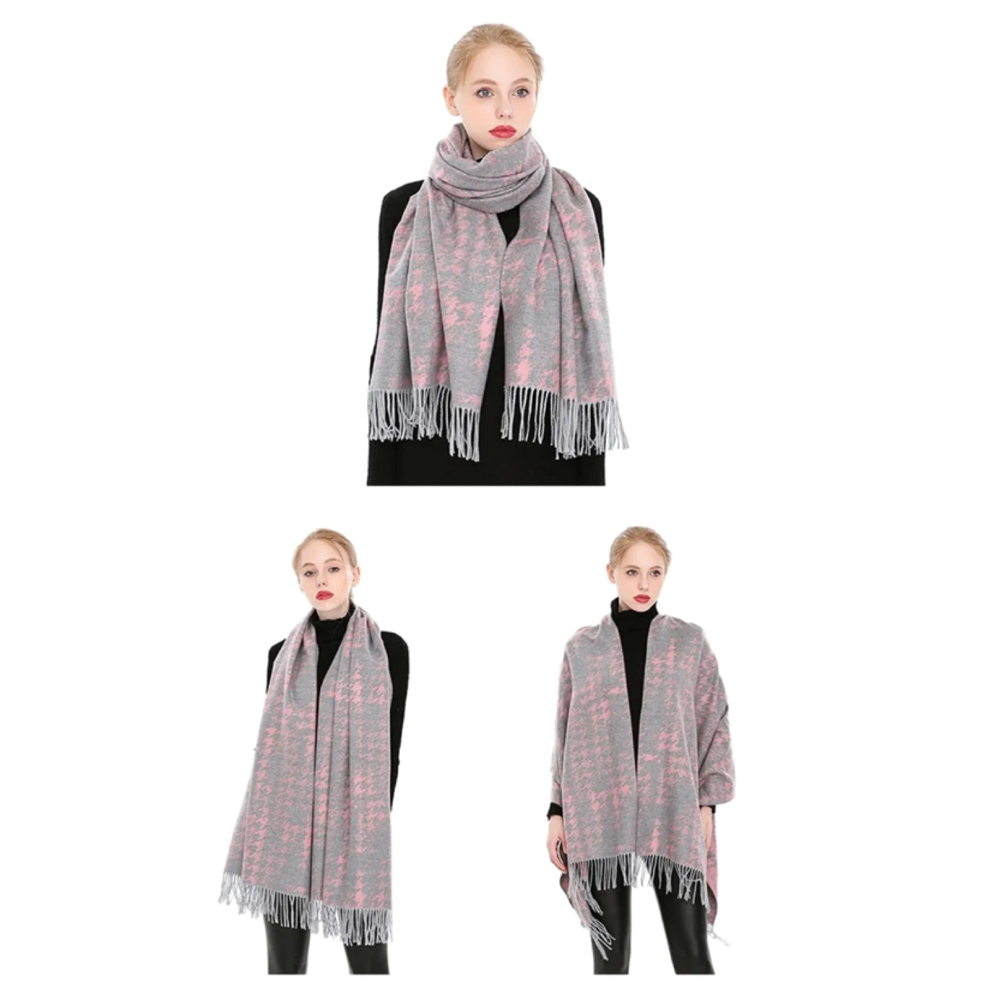 Grey and Pink Houndstooth Pattern Scarf with Tassels