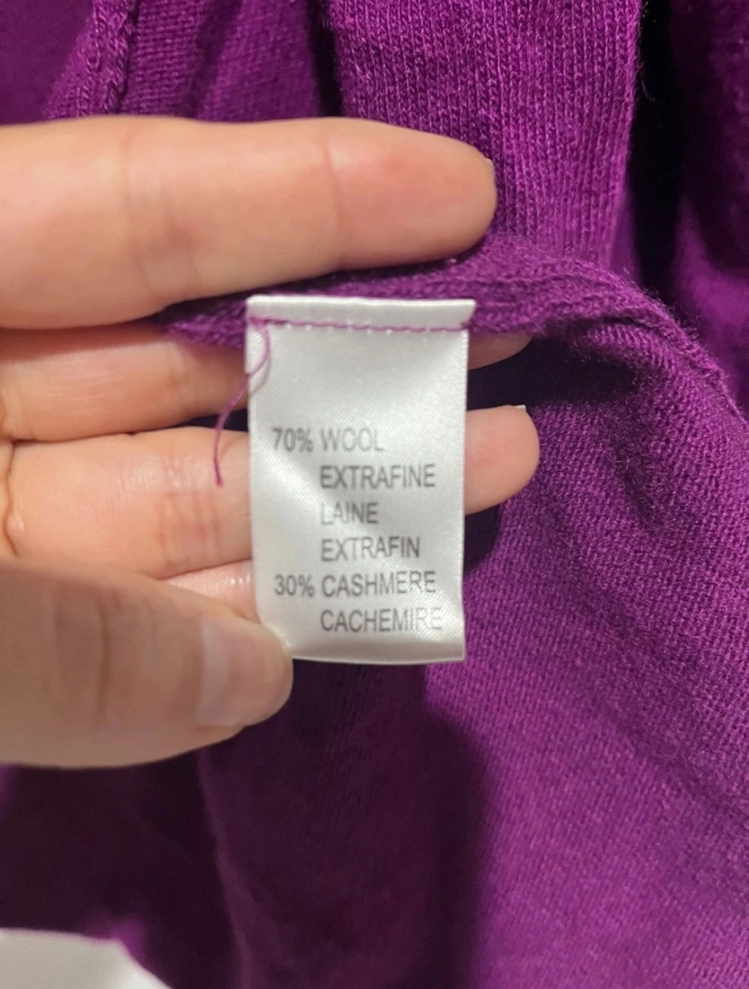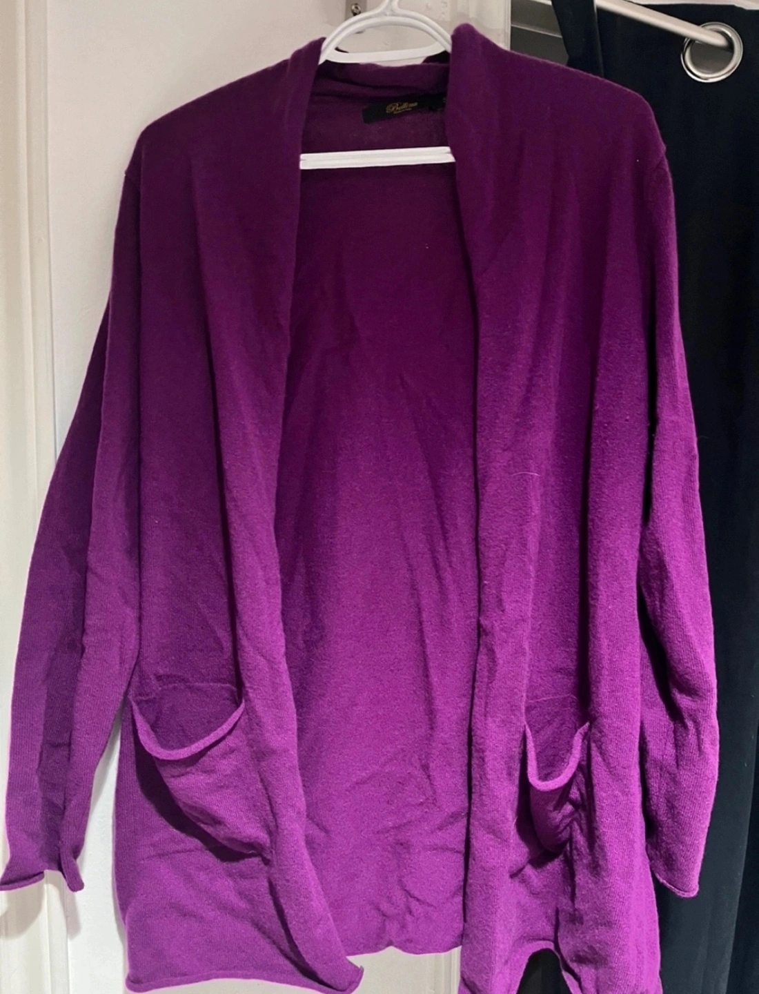 Women's purple cardigan. 70% extrafine wool, 30% cashmere. Long sleeves, open front, two pockets. Relaxed fit.
