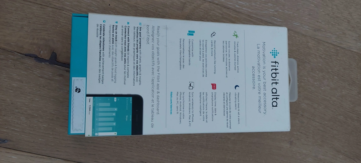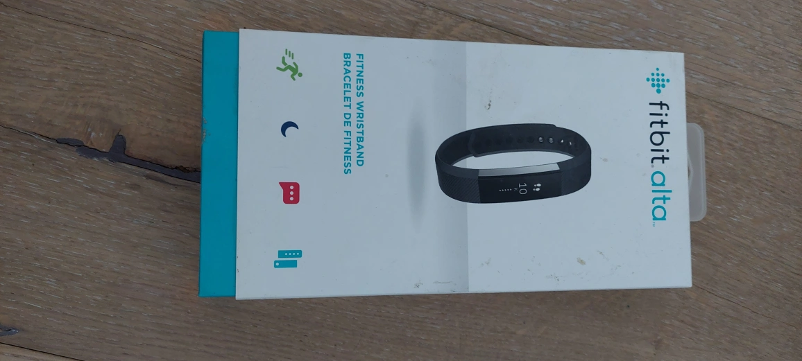 New, never used Fitbit Alta fitness tracker. Black band. Includes original box and packaging. Track your activity, sleep, and more.