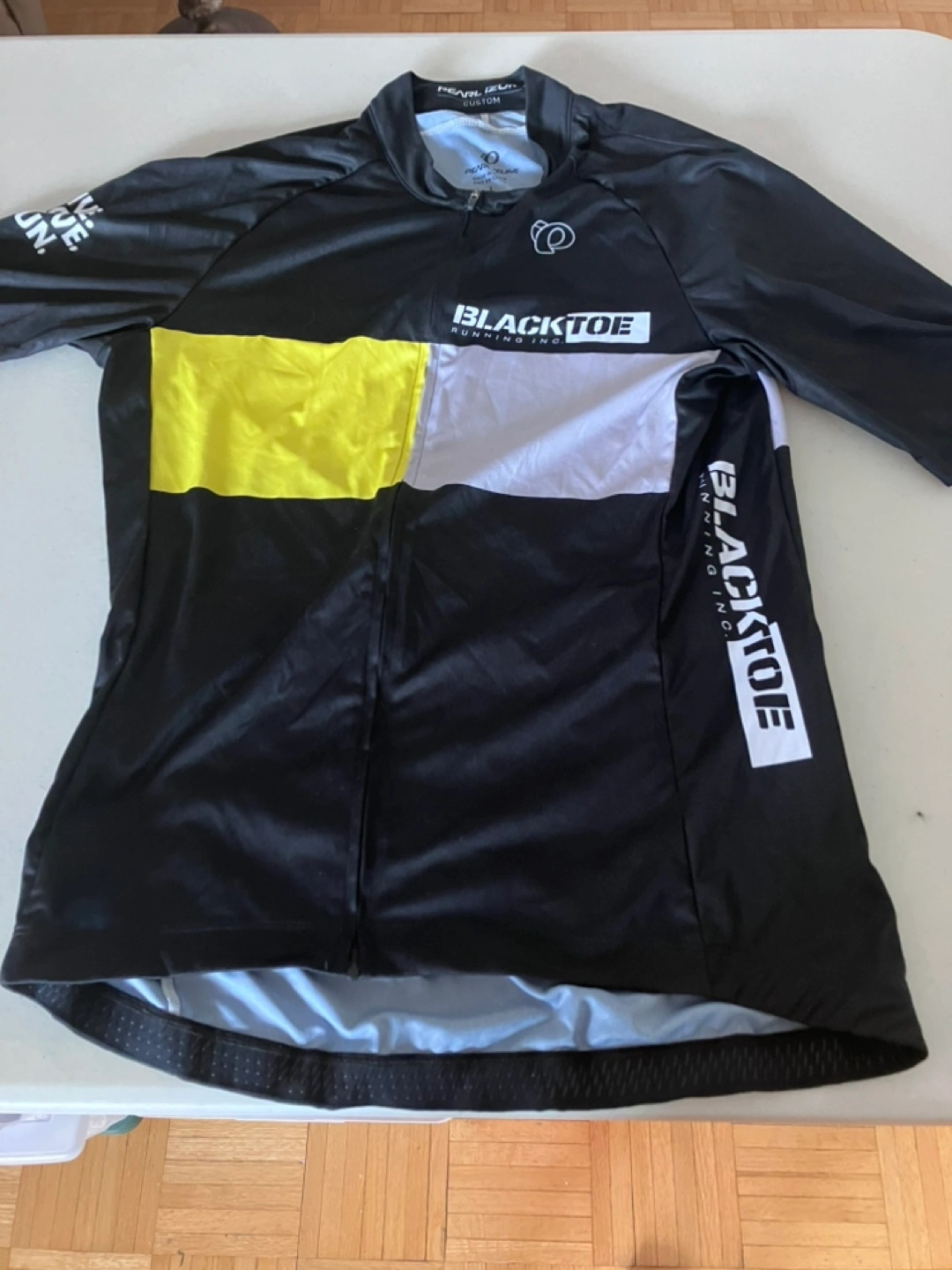 Men's Pearl Izumi cycling kit. Blacktoe Running Inc. design. Includes jersey and bib shorts. Size Large. Black, yellow, and white colour scheme.